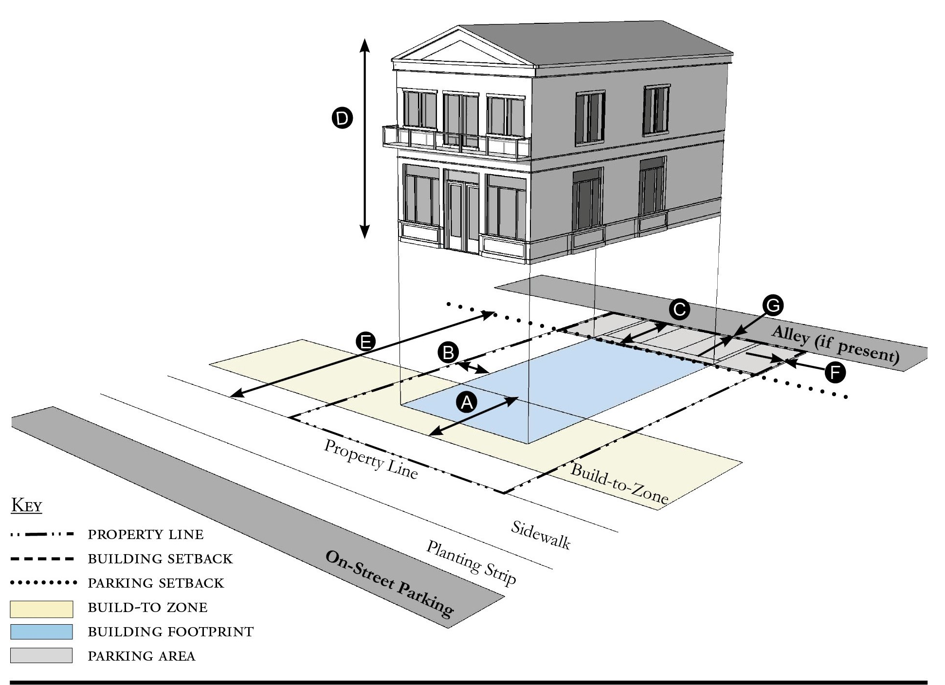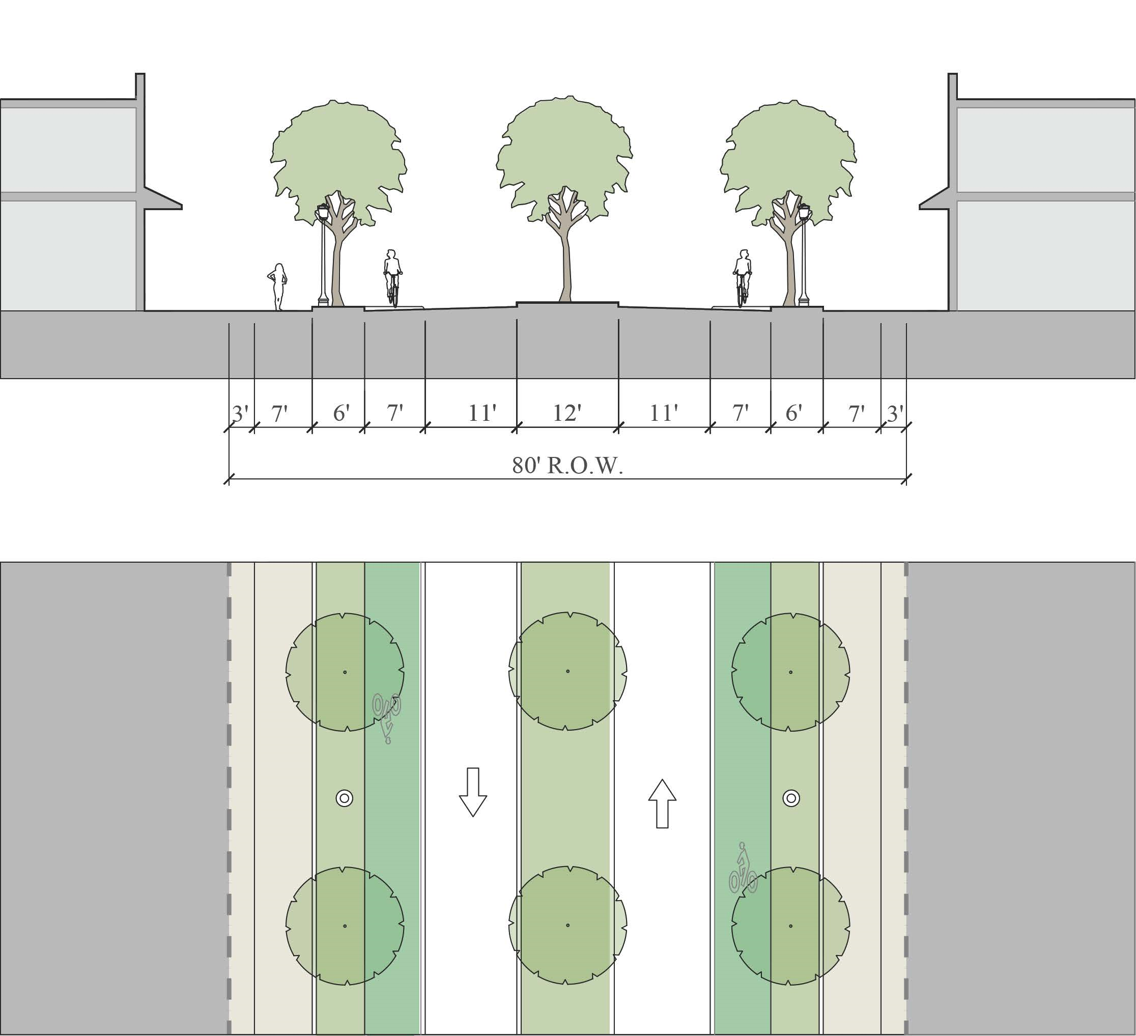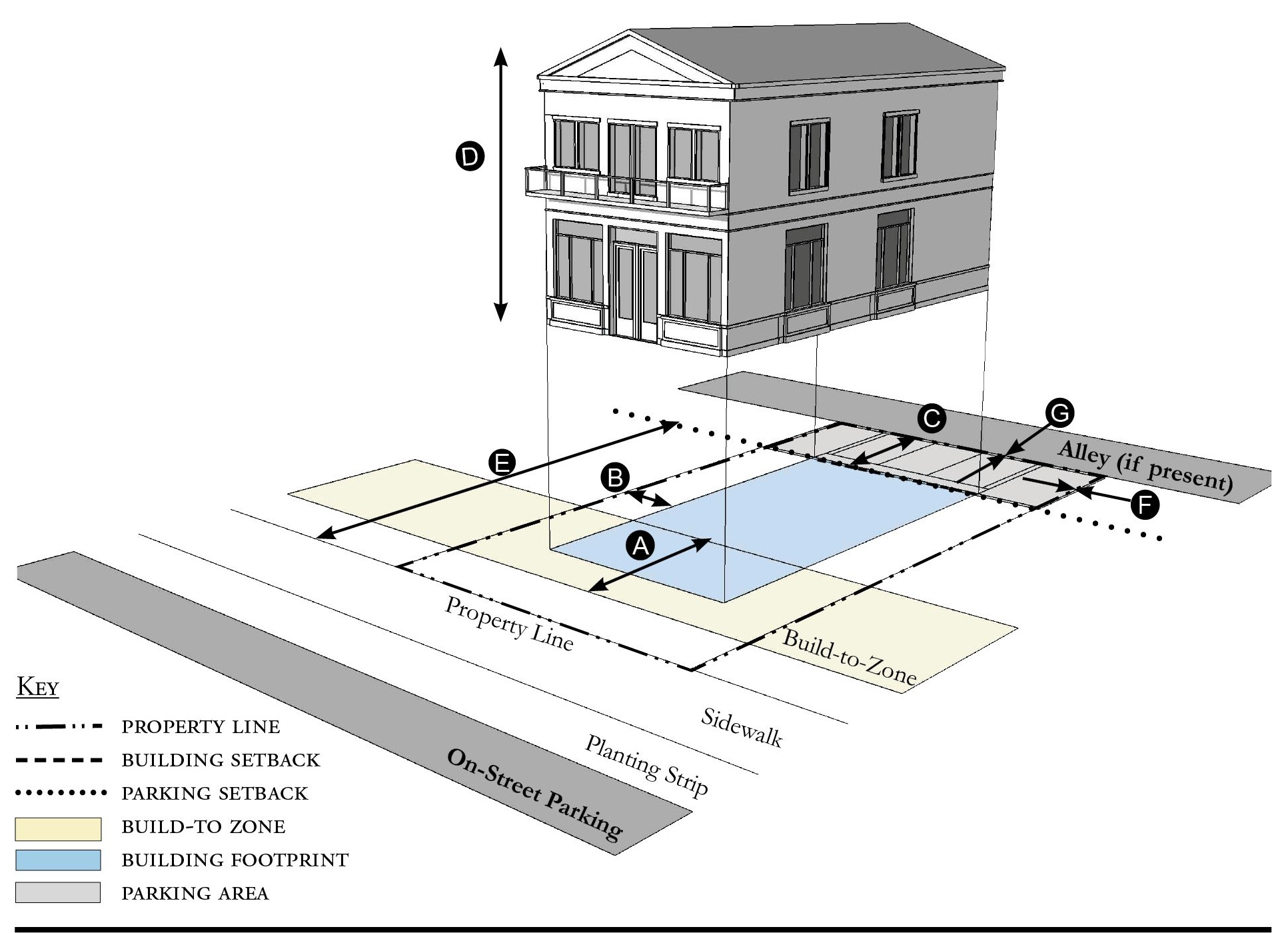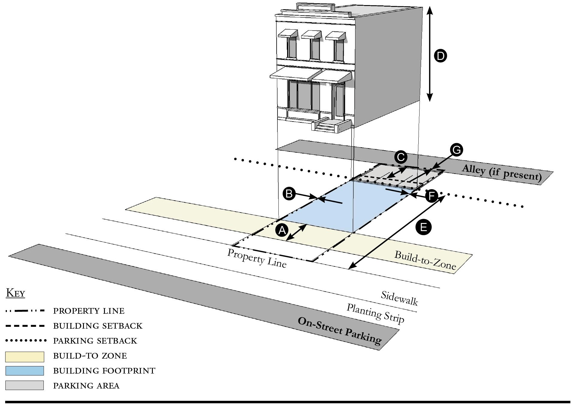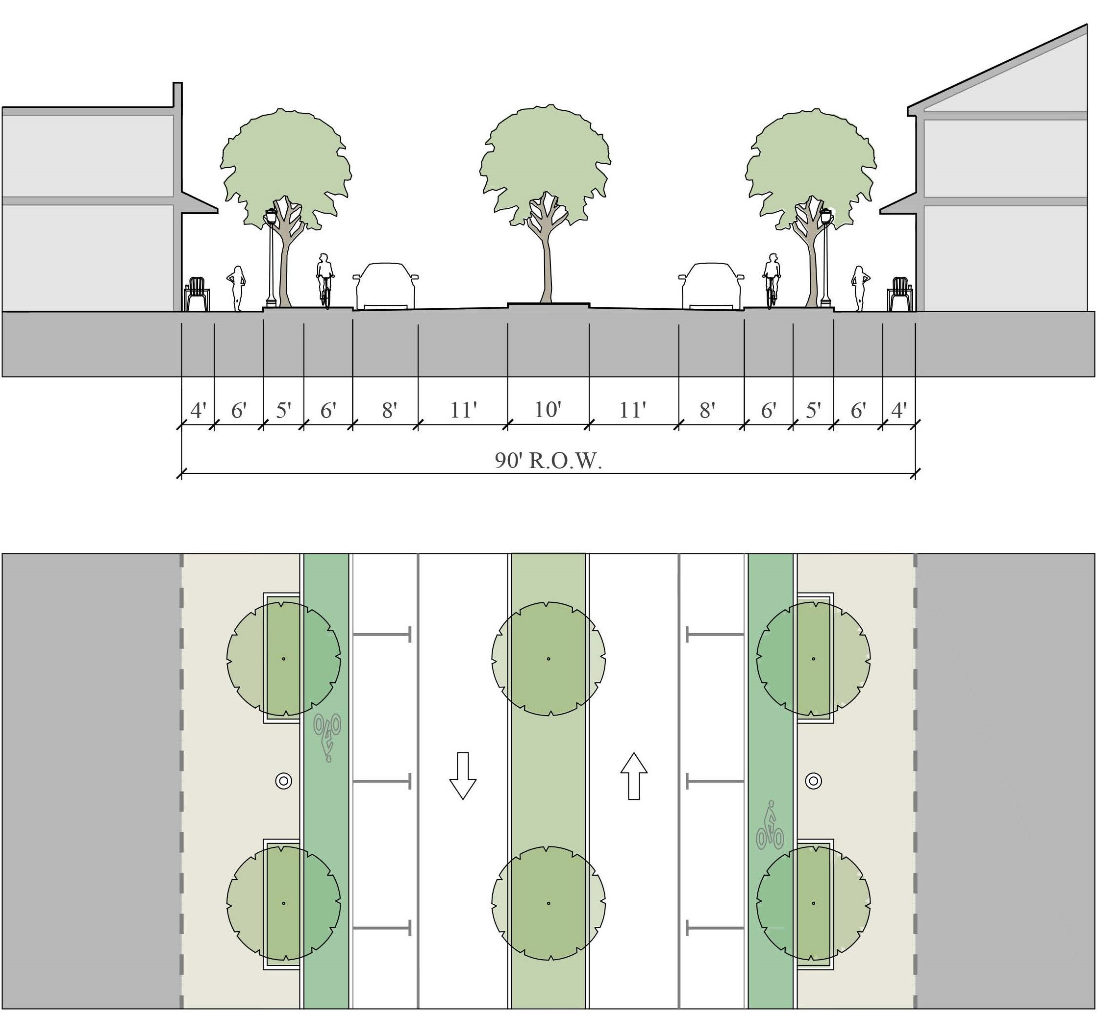 Alleys are important assets in the Redevelopment Zoning Districts, performing many functions within small rights-of-way. Alley rights-of-way should be retained and improved whenever feasible.