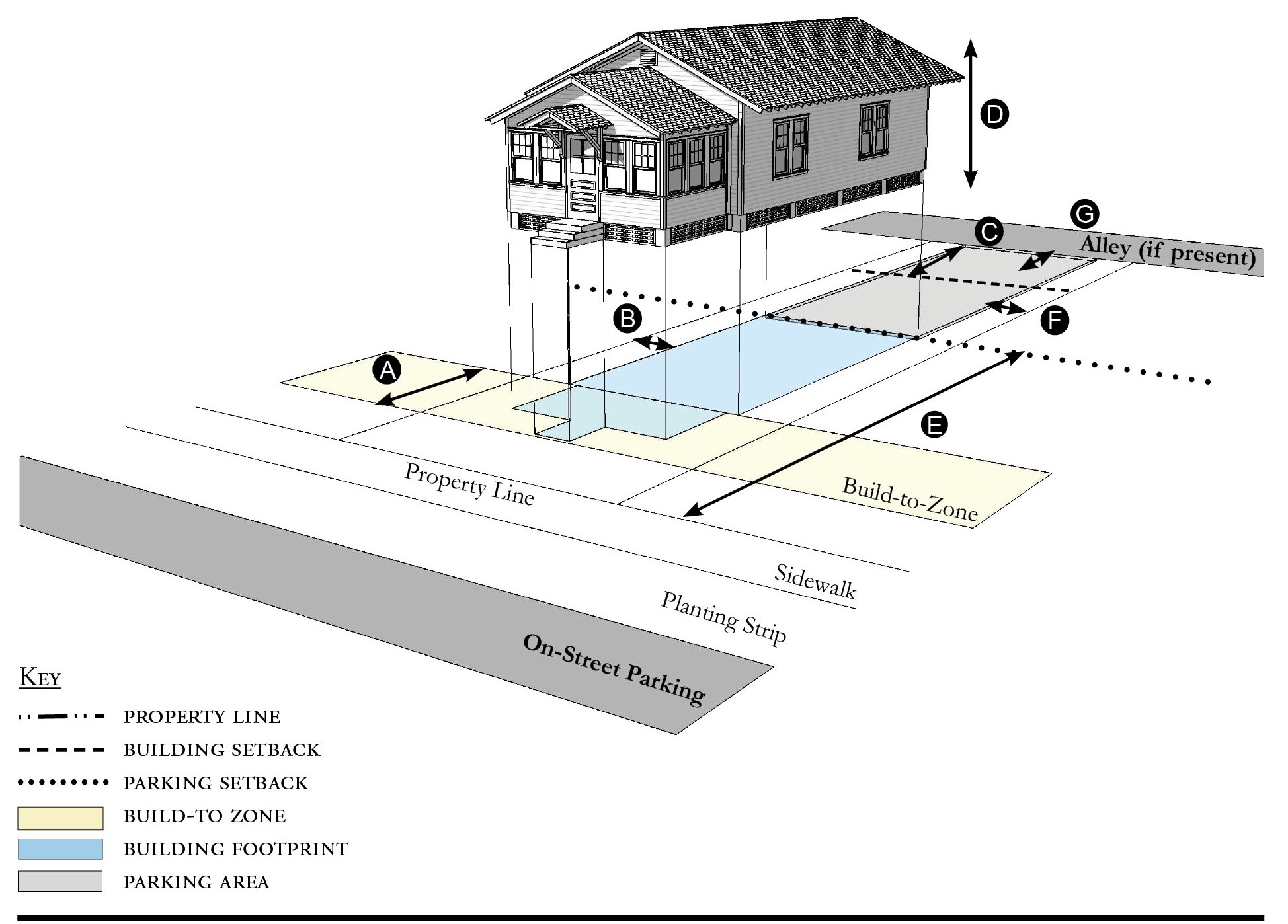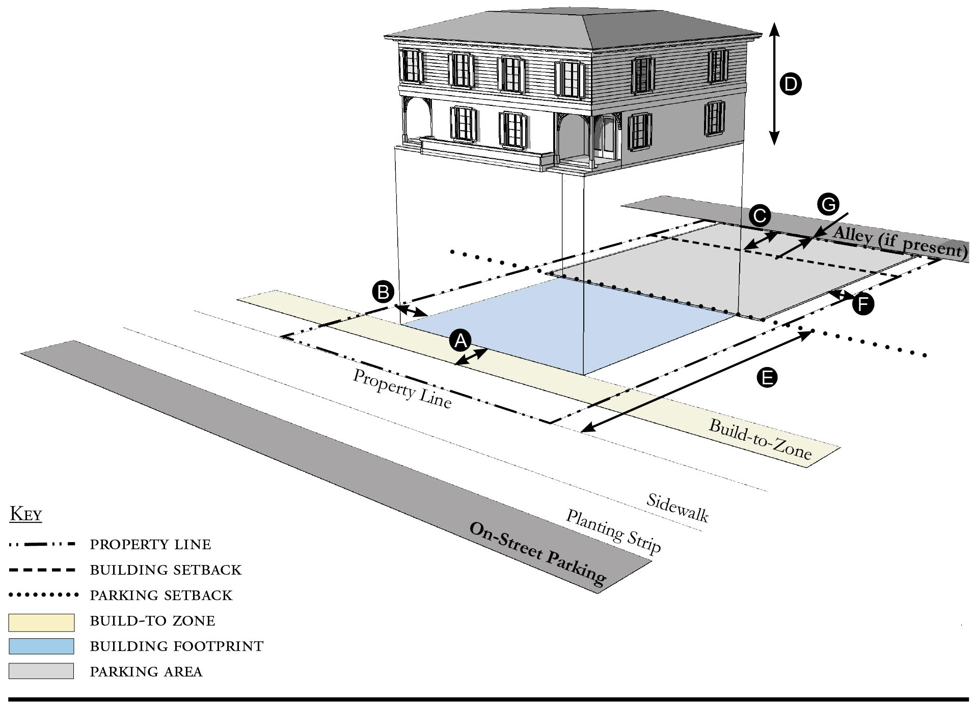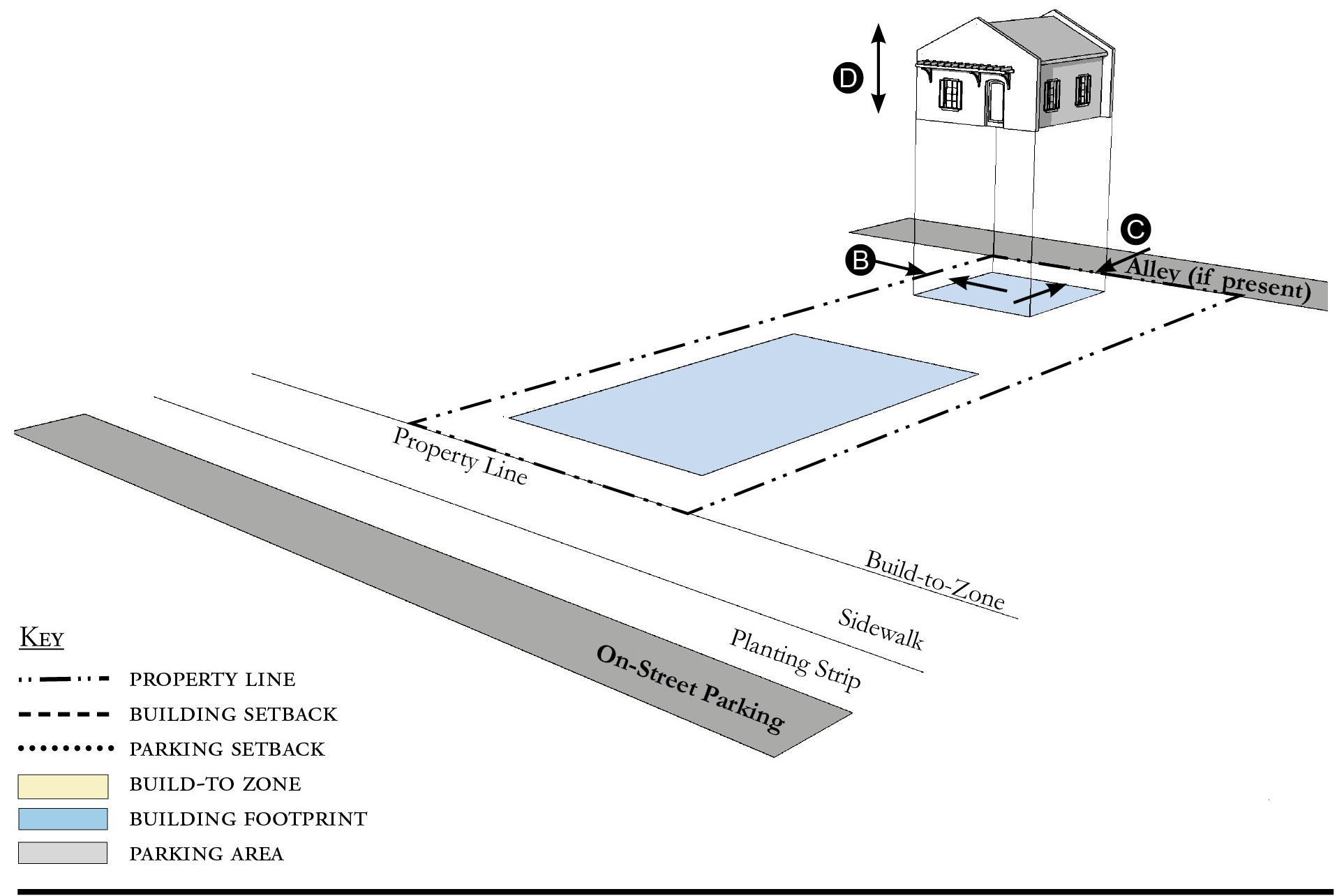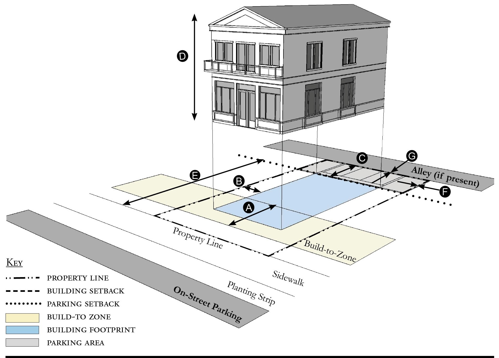 Alleys are important assets in the Redevelopment Zoning Districts, performing many functions within small rights-of-way. Alley rights-of-way should be retained and improved whenever feasible.