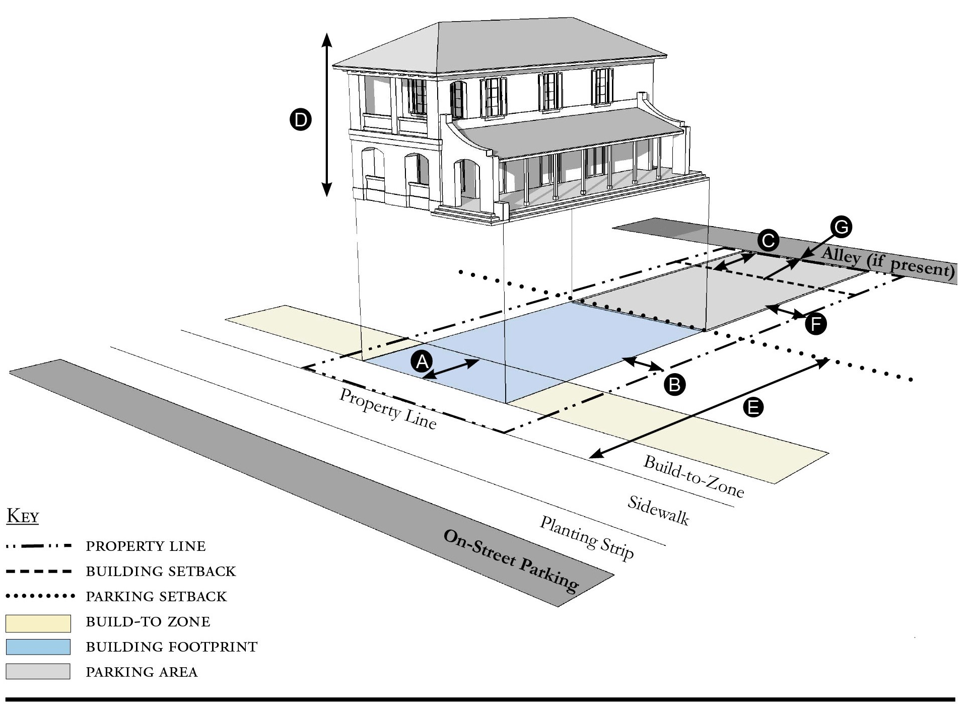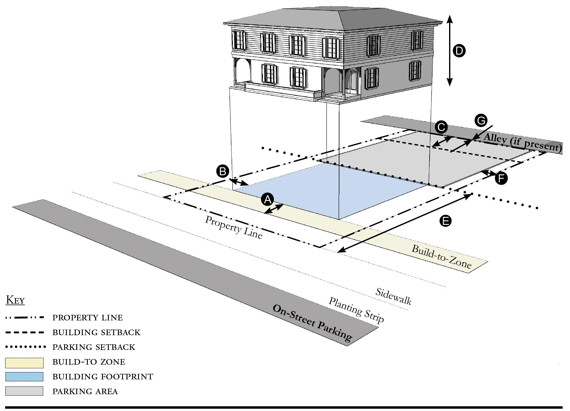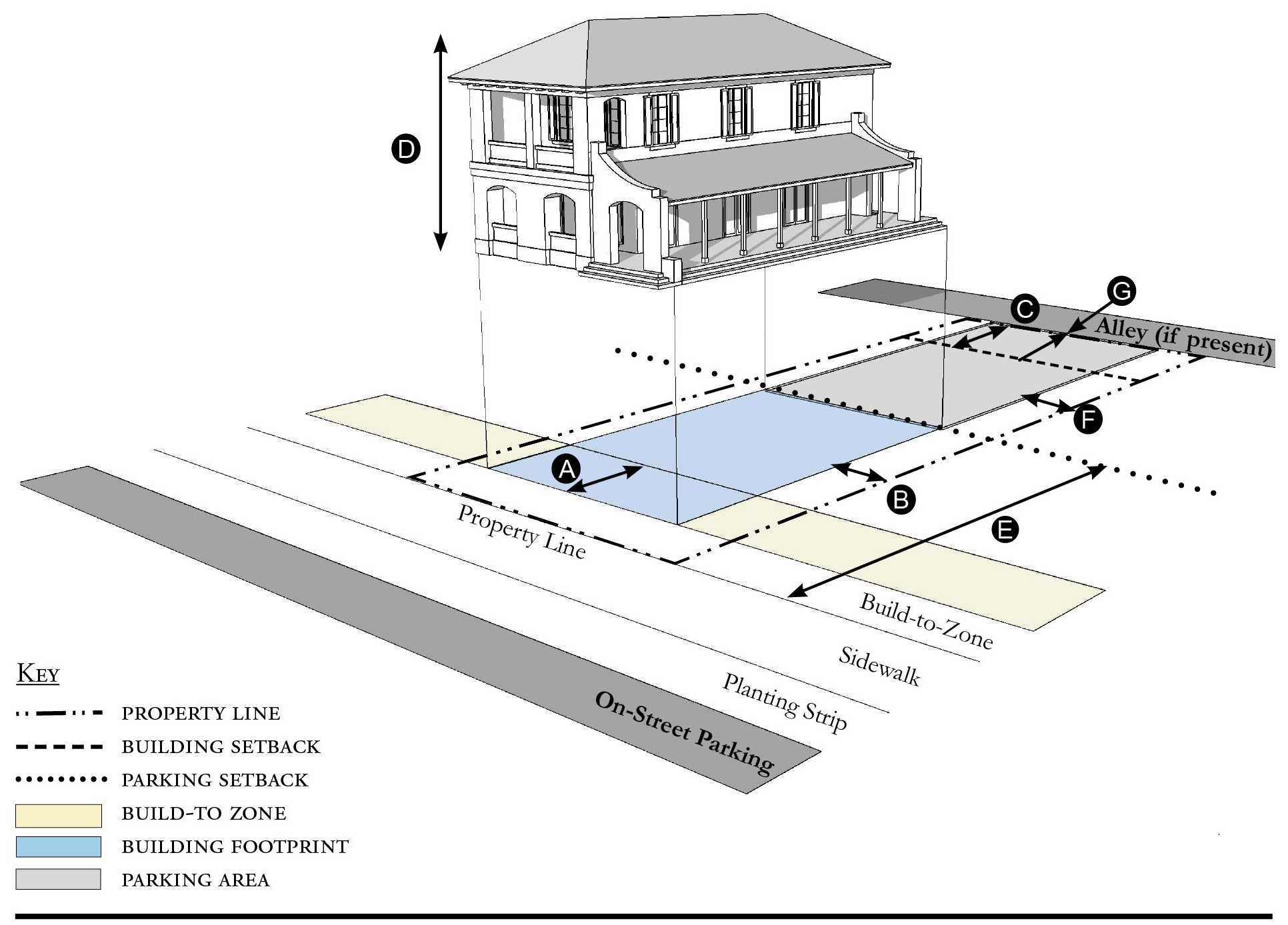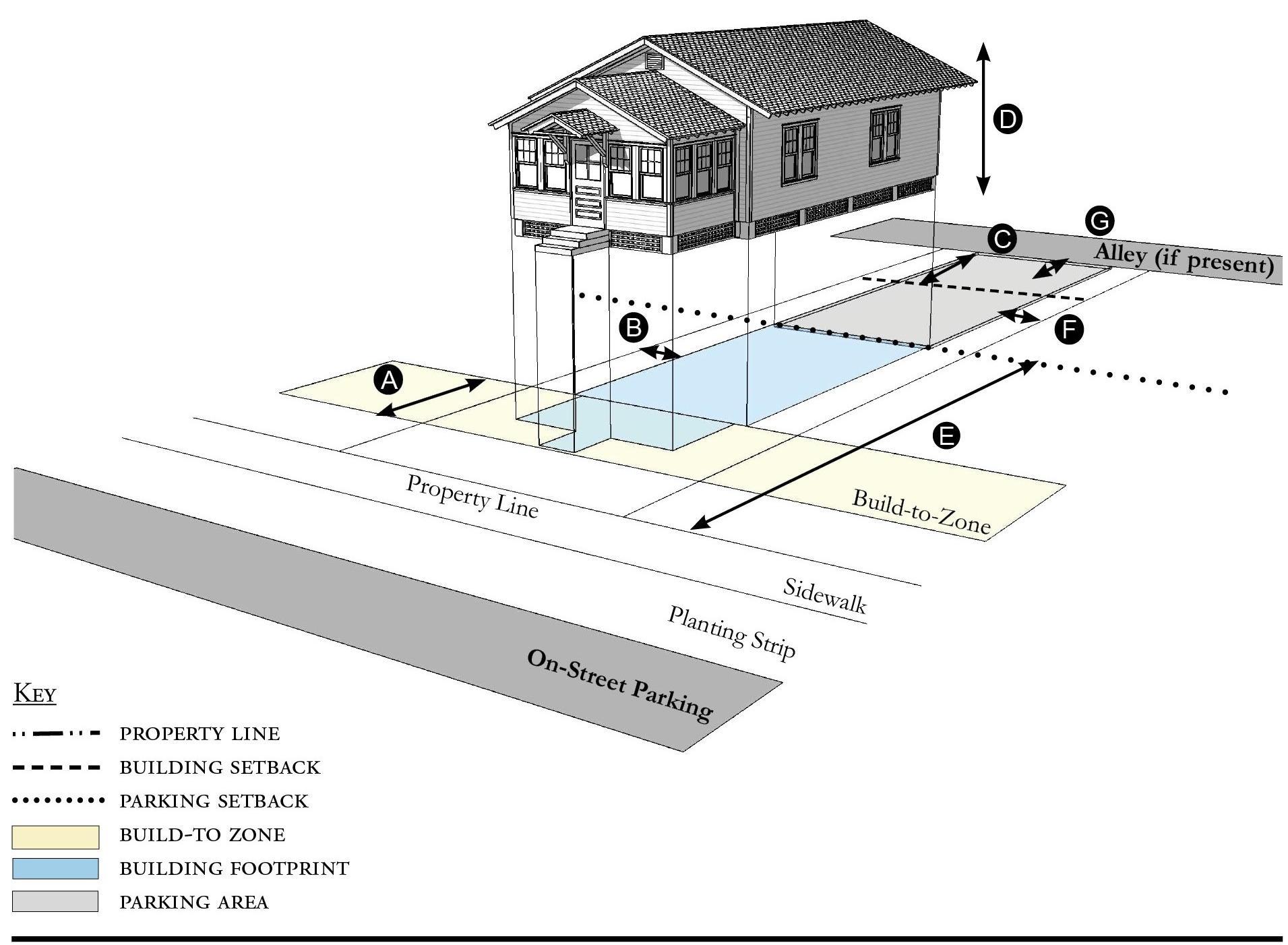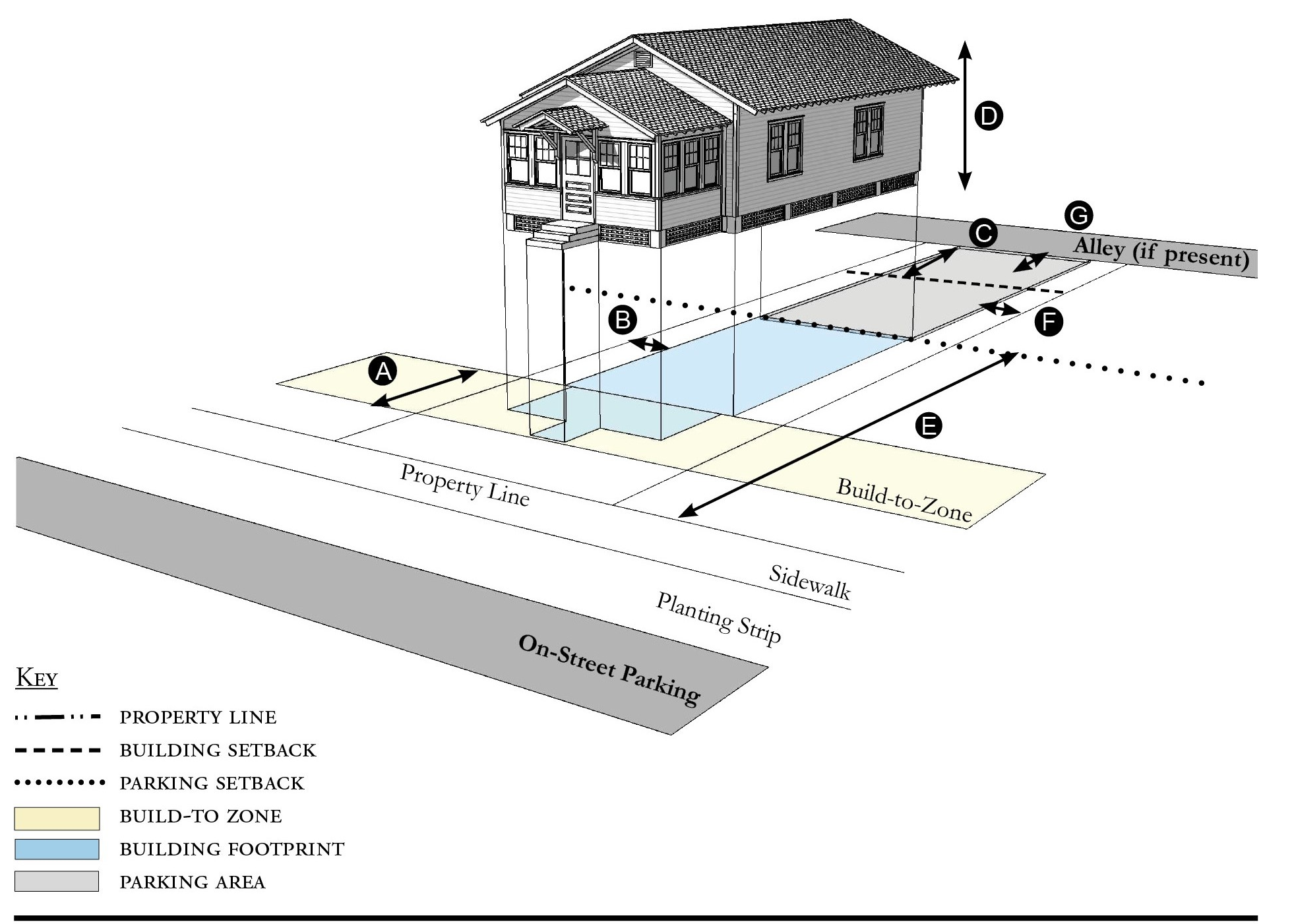 Alleys are important assets in the Redevelopment Zoning Districts, performing many functions within small rights-of-way. Alley rights-of-way should be retained and improved whenever feasible.