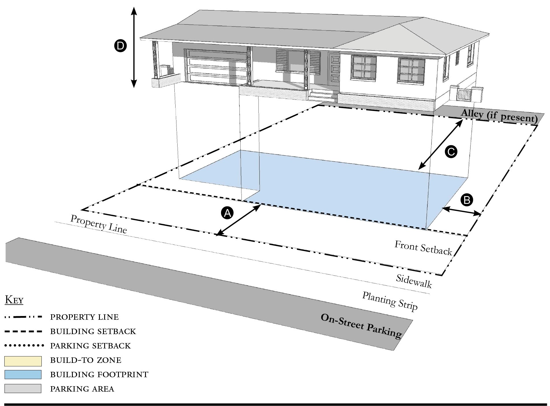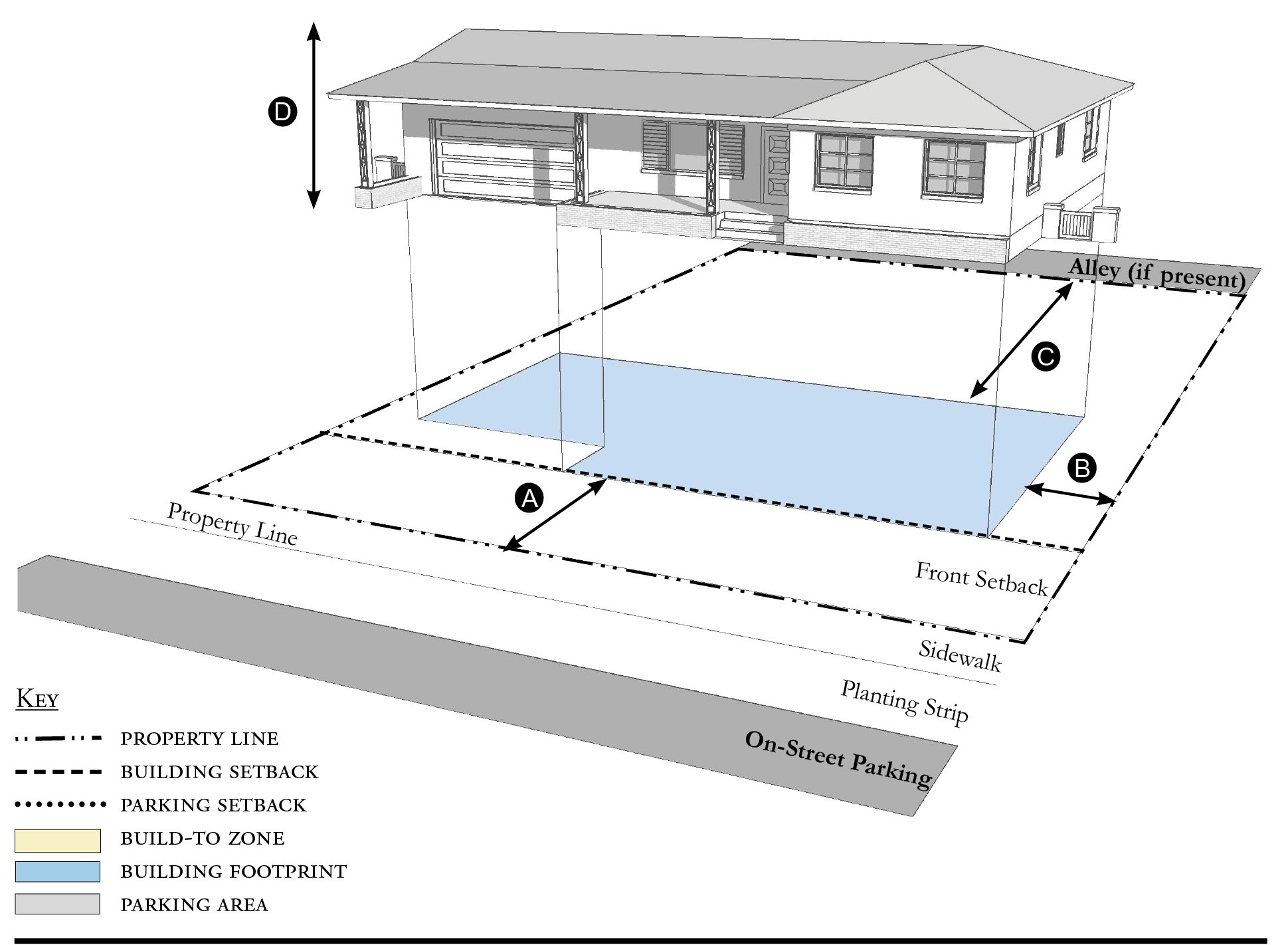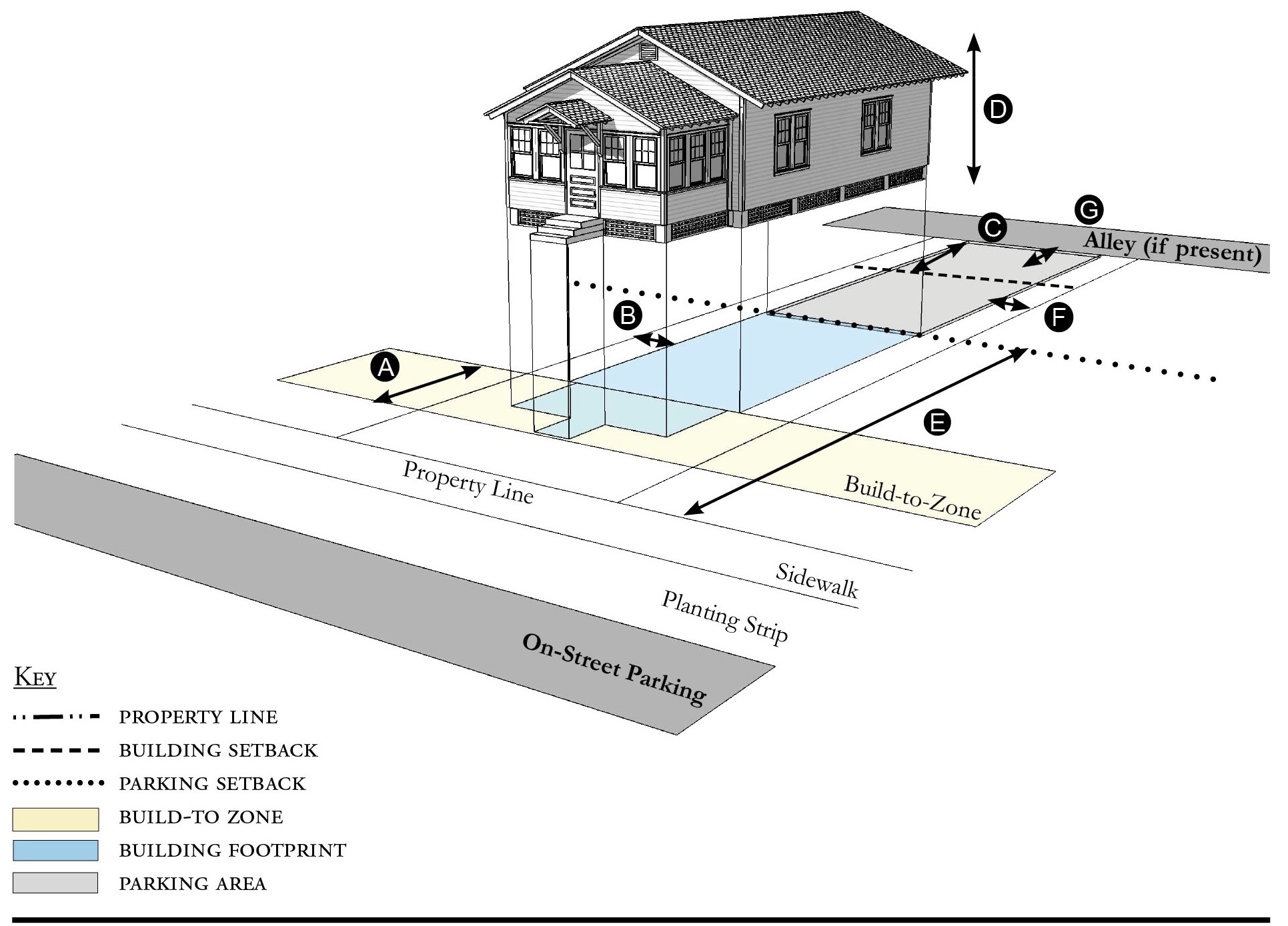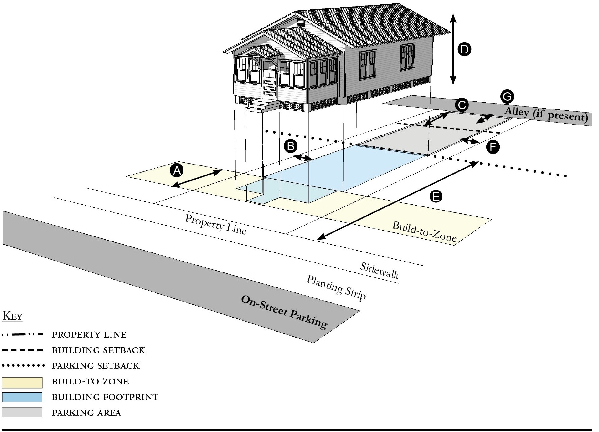 Alleys are important assets in the Redevelopment Zoning Districts, performing many functions within small rights-of-way. Alley rights-of-way should be retained and improved whenever feasible.