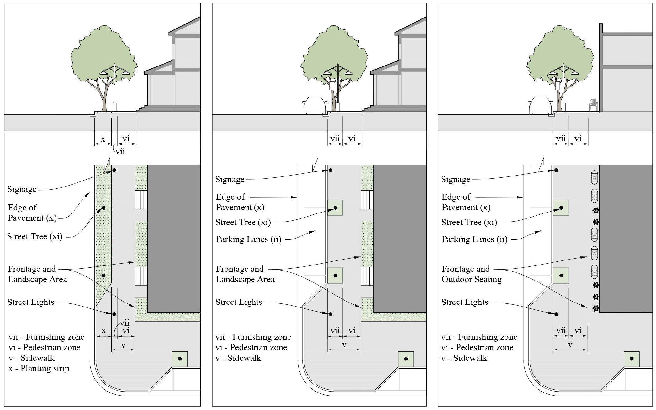 Within the Core, Corridor and Industrial Subdistricts. The build-to-zone shall provide for a pedestrian zone, furnishing zone, and on-street parking as described in Section 12.1.06. No less than ten feet shall be provided for the combined pedestrian zone and furnishing zone.