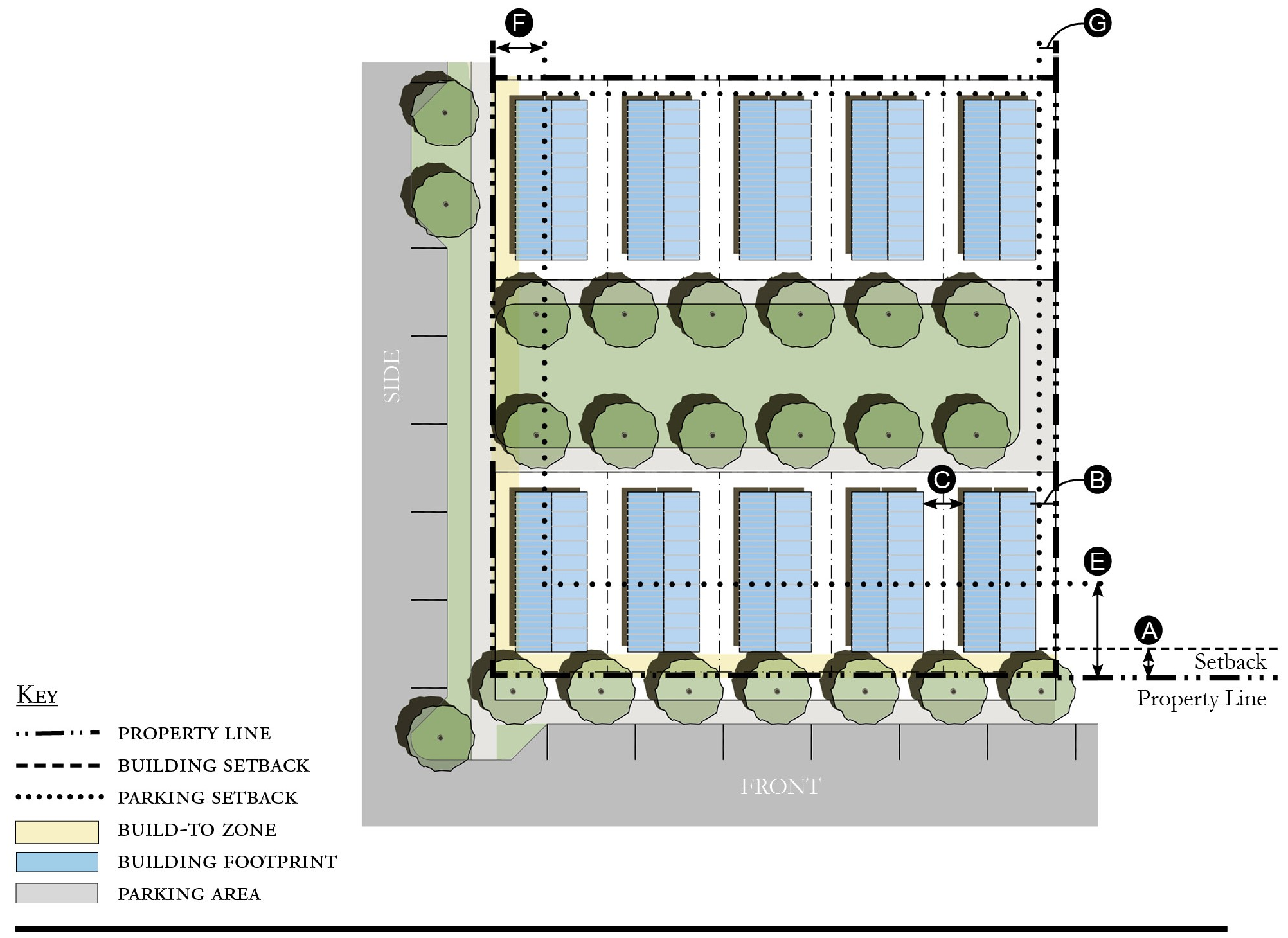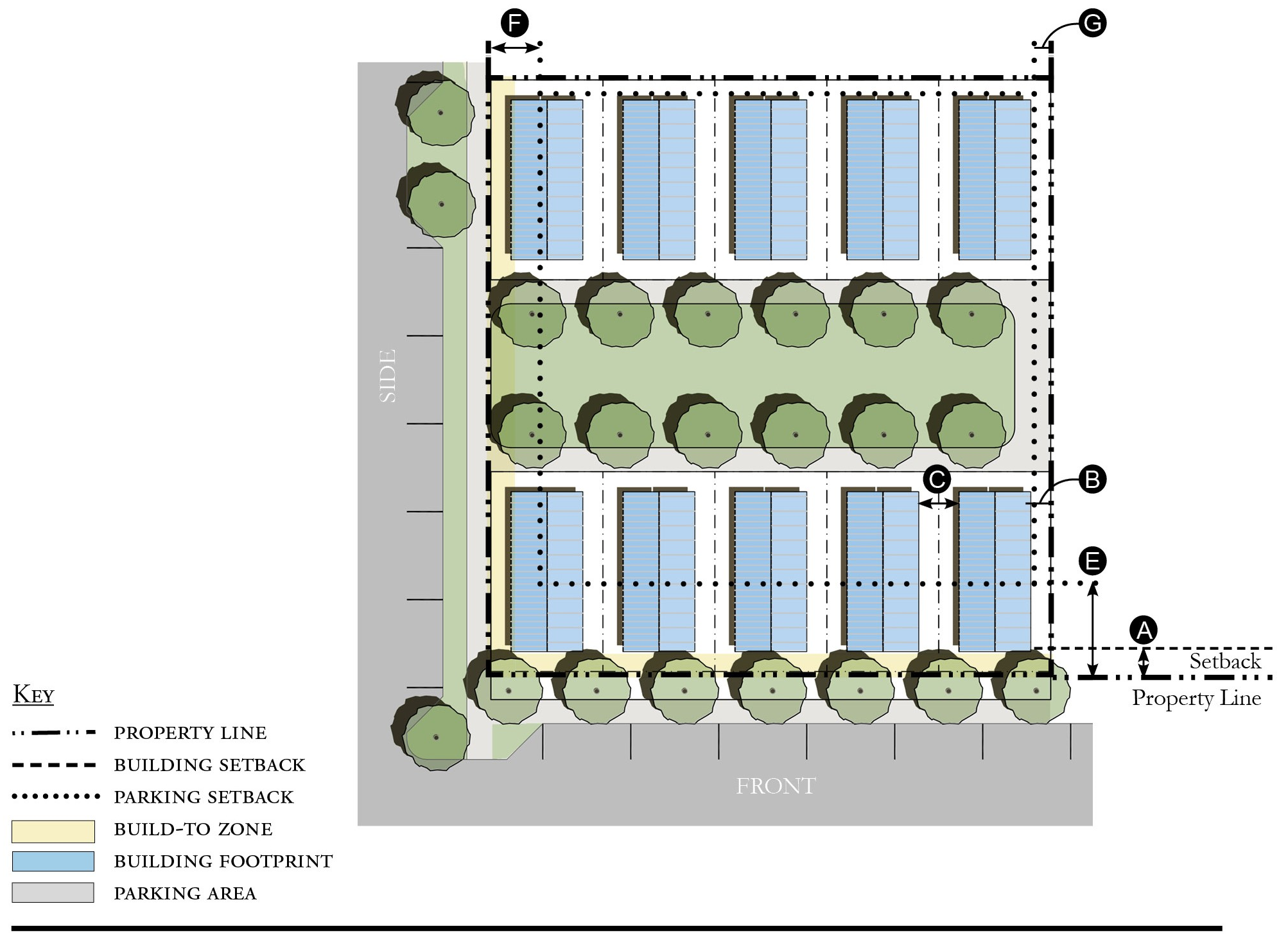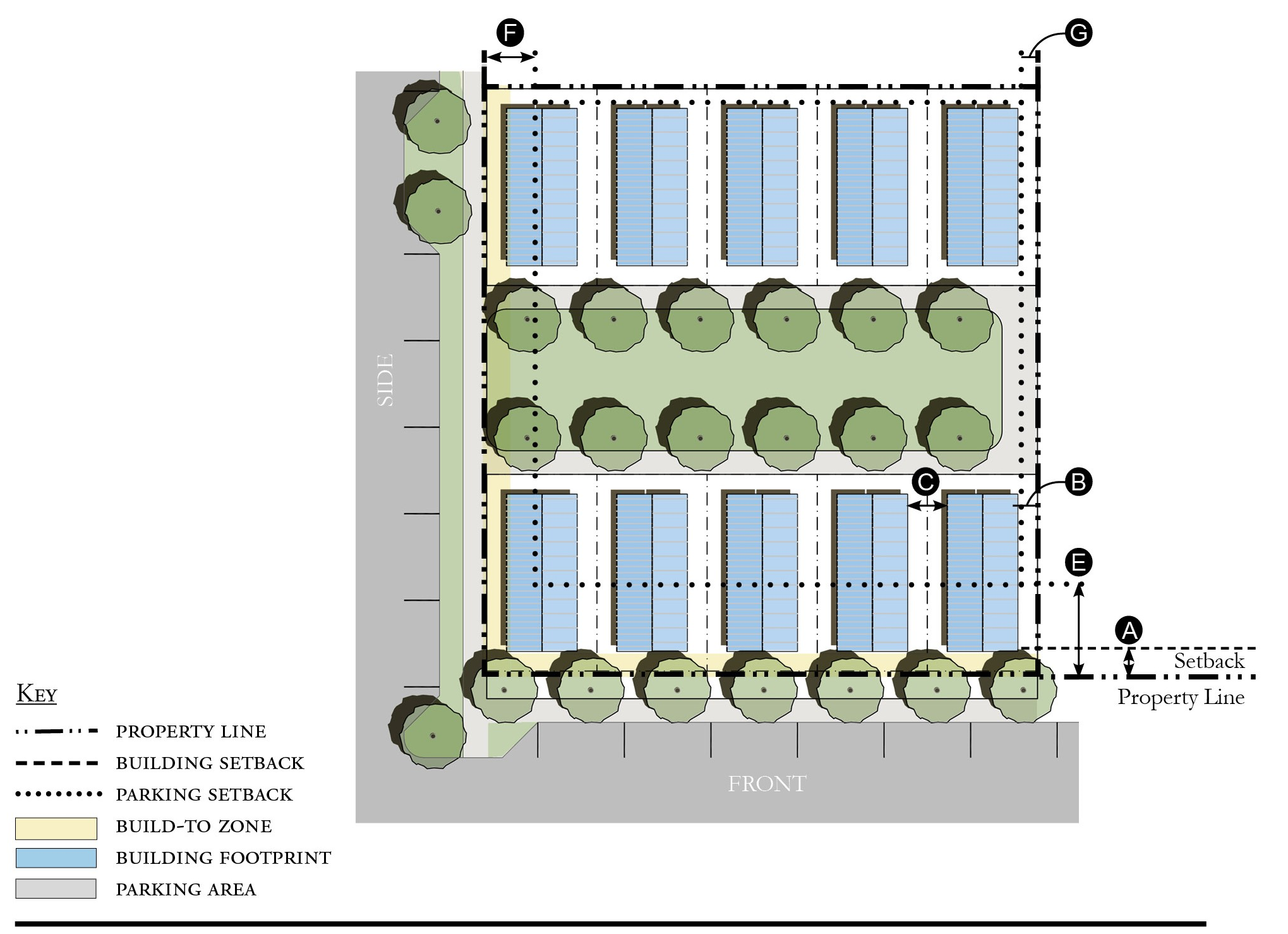 The front setback shall be treated with Required Landscape Area and Tree Planting as described in Table GG-10 Section 12.7.09 when Frontage Types are not provided.