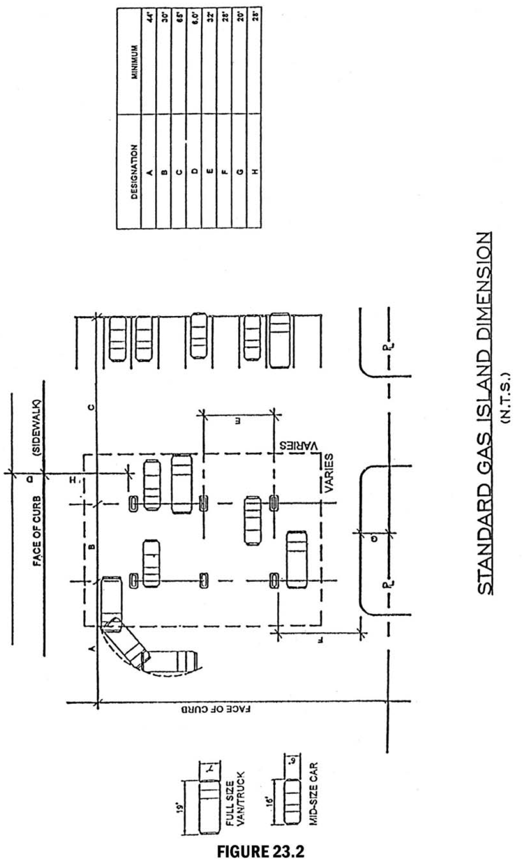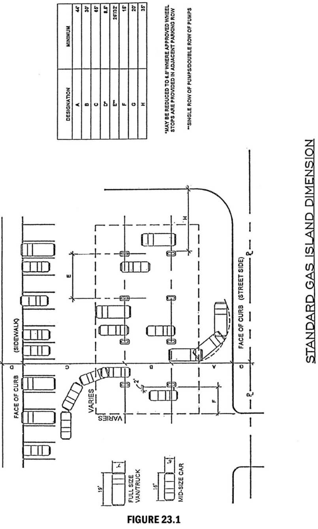 Lane width. Except as otherwise noted elsewhere in this section, all fuel dispensing facilities shall be designed to provide the minimum space requirements that are indicated on the following pages in figures 23.1 and 23.2, standard gas island dimension.