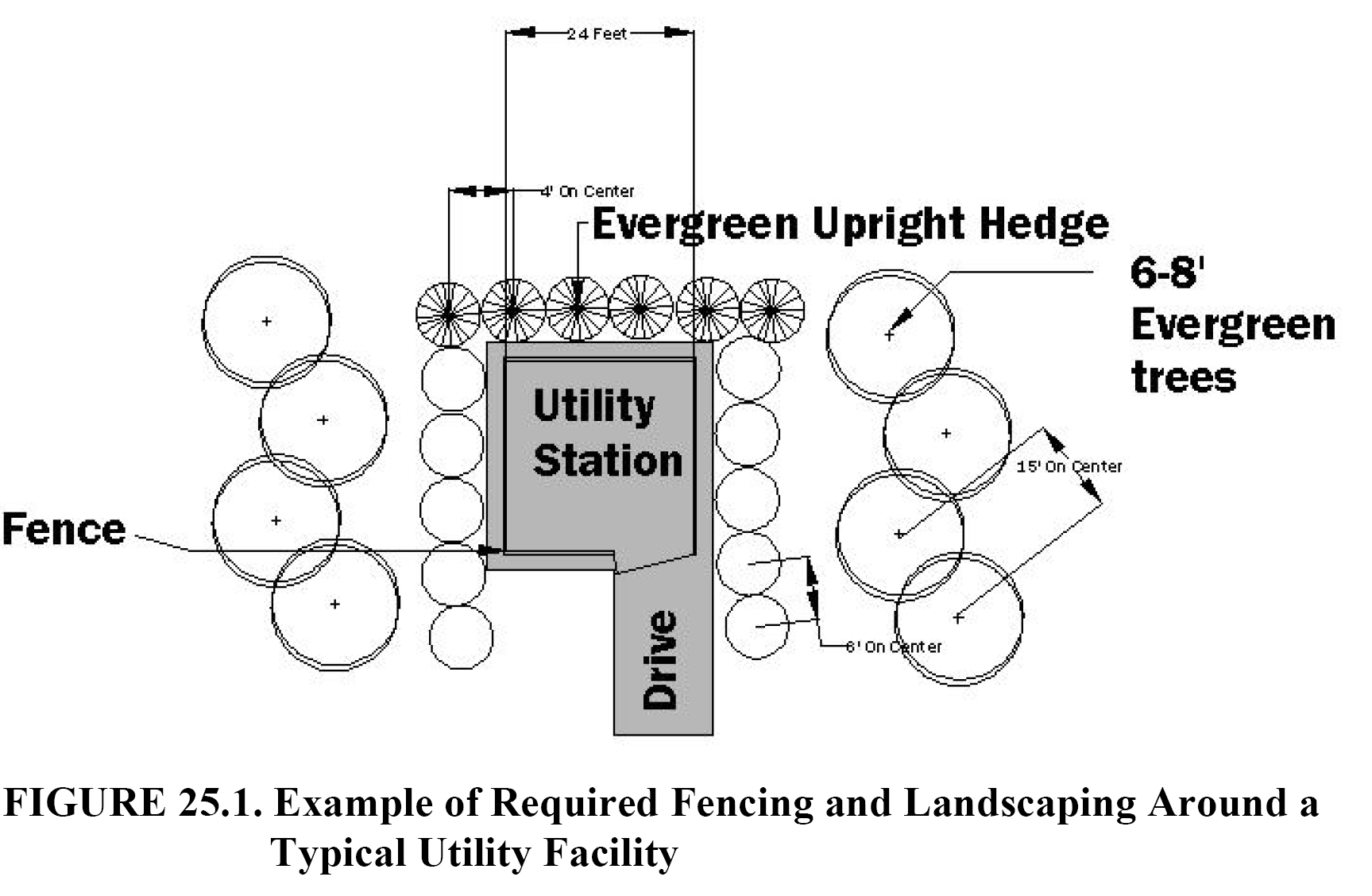 Six- to eight-foot high evergreen trees shall be planted on either side of the utility station, three (3) for every twenty-four (24) feet of linear length of the utility station.