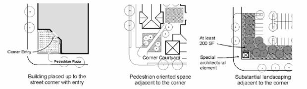 Enhance the appearance of street corners on SR-3. Development of street corner properties should contribute to a sense of community and/or the demarcation of the area. Specifically, all development proposals for sites adjacent to public street intersections along the SR-3 corridor should include at least one of the design treatments described below (See Figure 1).