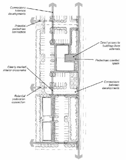 Improve the pedestrian environment by making it easier, safer and more comfortable to walk between businesses and properties, to the street sidewalk, to transit stops, and through parking lots;