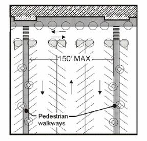 New development shall provide pathways through parking lots. A specially marked or paved crosswalk must be provided through parking lots greater than one hundred fifty feet long (measured parallel to the street front) or more than two bays deep (approximately seventy-five feet measured perpendicular from street front). Generally, walkways should be provided at least every one hundred fifty feet measured perpendicularly to the building face with a main entry. This distance should be considered somewhat flexible to account for the length of the parking lot and driveway locations. Additional design criteria: