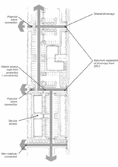 For new commercial development projects, strive to create major driveways that serve more than one property and/or business. Cross-access easements for adjoining properties may be required by the county, where necessary.