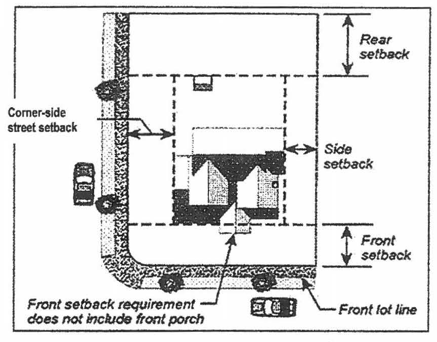 Corner lots - setbacks. Unless otherwise specified in the zoning district or an overlay zoning district, the front and corner side setbacks shall be determined based on the building orientation, architectural front of the building and the street proposed driveway access to the lot. Refer to Figure 3-11.1B, Corner Lot for standard setback application.