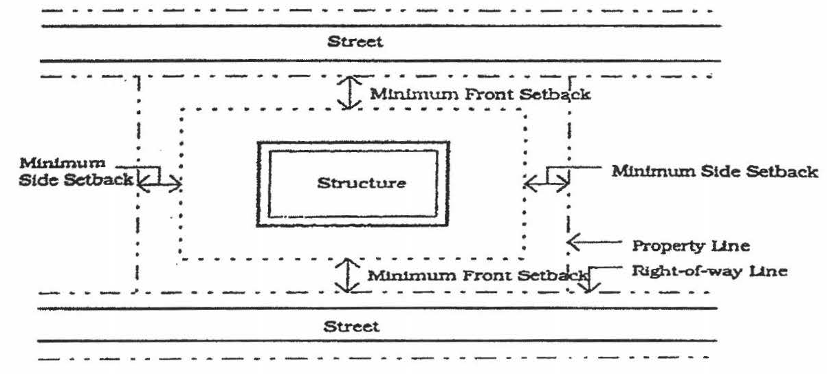 Minimum setback. Minimum setback is the space defined by measuring perpendicularly from and along the entire boundary of the lot (property line) to the building line. Front setbacks shall be measured from the street right-of-way line.
