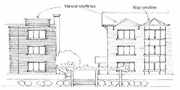 Roof Design. Roof lines shall vary and be expressed in a visually interesting manner that complements the composition of the building and the surrounding area. This can be achieved through the use of dormers, varied cornice lines and/or parapets, and other similar architectural features. Roofs shall reflect the traditional character of the immediately surrounding area—the roof shall be a type that is commonly found in the surrounding area as determined by the Business and Development Services Director.