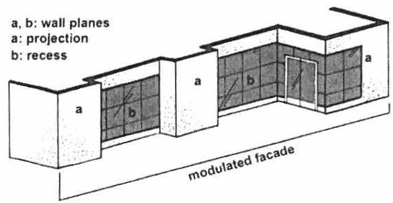Façade—Horizontal Massing. Buildings shall incorporate varied massing and design across long façades. Building walls shall be articulated at a minimum of every 50 feet. Articulation may include storefront bays with modulating building elements such as recesses, projections, expressed entries, building form, columns, pilasters, colonnades, arcades, and/or other clearly expressed architectural details. No horizontal section of the building façade shall exceed 50 feet without incorporating visible changes in the façade elevation.