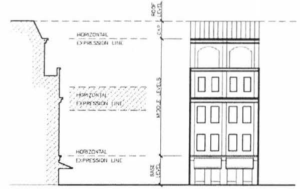 Façade—Vertical Massing. In order to modulate their scale, multi-story buildings shall individually articulate the base, middle, and cap through the use of expression lines, cornices, string cornices, step-backs, or similar articulating feature. For the purposes of this section, the base generally includes the ground floor of the building, including entryways and windows; the middle is generally described as the upper stories of a building and typically features windows and/or balconies; the cap includes the area from the top floor to the roof of the building.