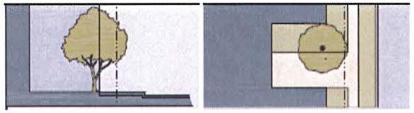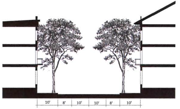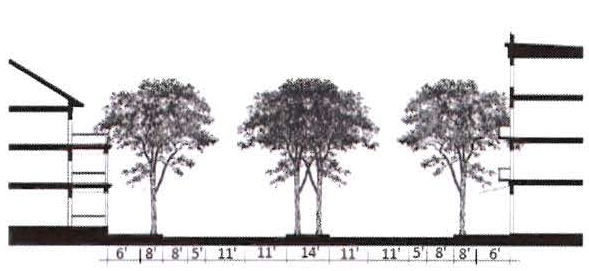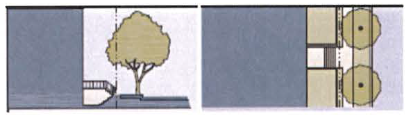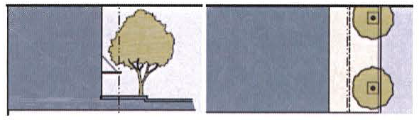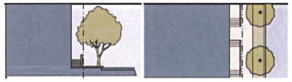 Street trees may be planted in a continuous planting strip of not less than seven (7) feet in width, in-ground planters, or may be located in tree grates, bulb outs (etc.) as part of a coordinated streetscape design.