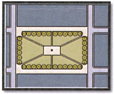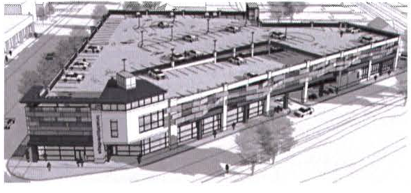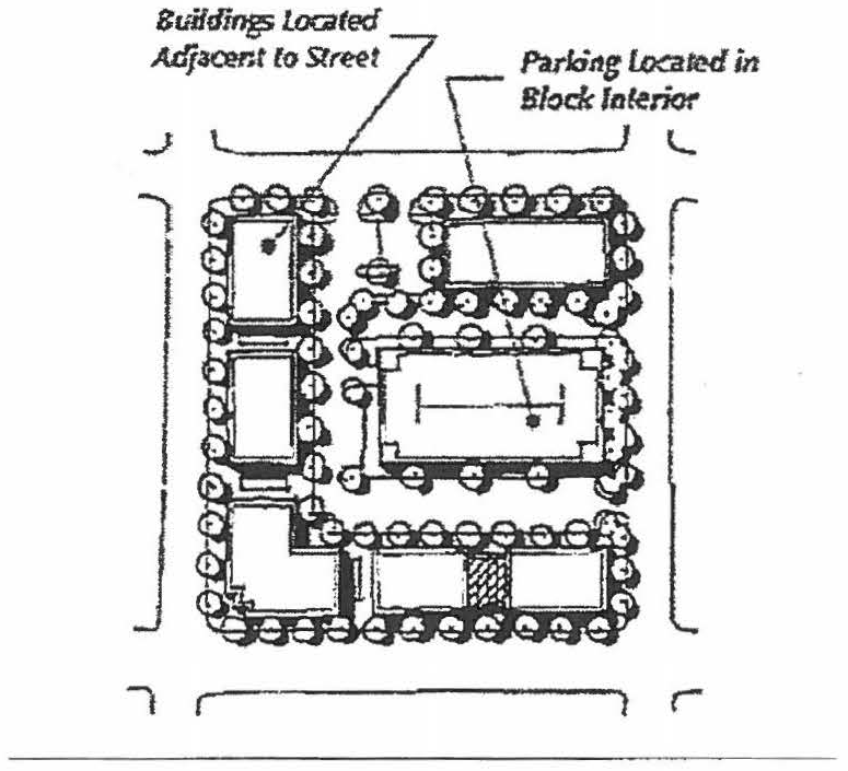 Location. In order to minimize the negative impact of large paved surfaces and maintain the quality of the visual environment, new surface parking lots and parking structures should located in the block interior, side and rear yards and not be located between the building and any abutting street.