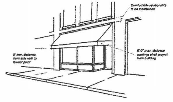 Awnings should be designed with individual awnings for each window and door opening rather than a single awning extending over multiple window openings or masonry piers or arches. Notwithstanding, a single awning may be permitted to extend over fully operable storefront sections and/or café areas.