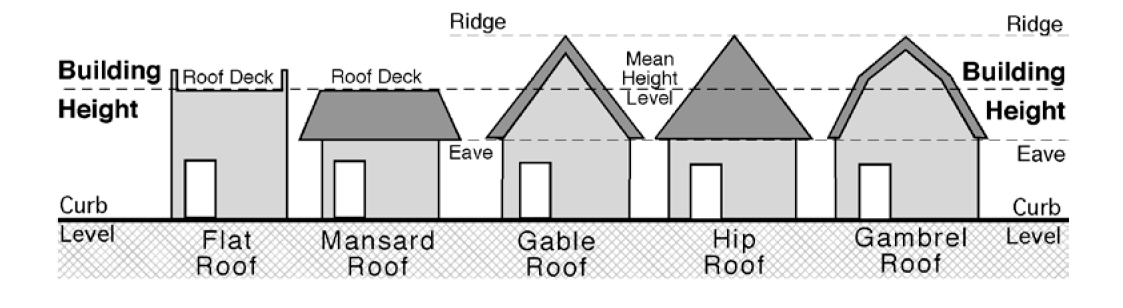 • The mean height between eaves and ridge for gable, hip and gambrel roofs.