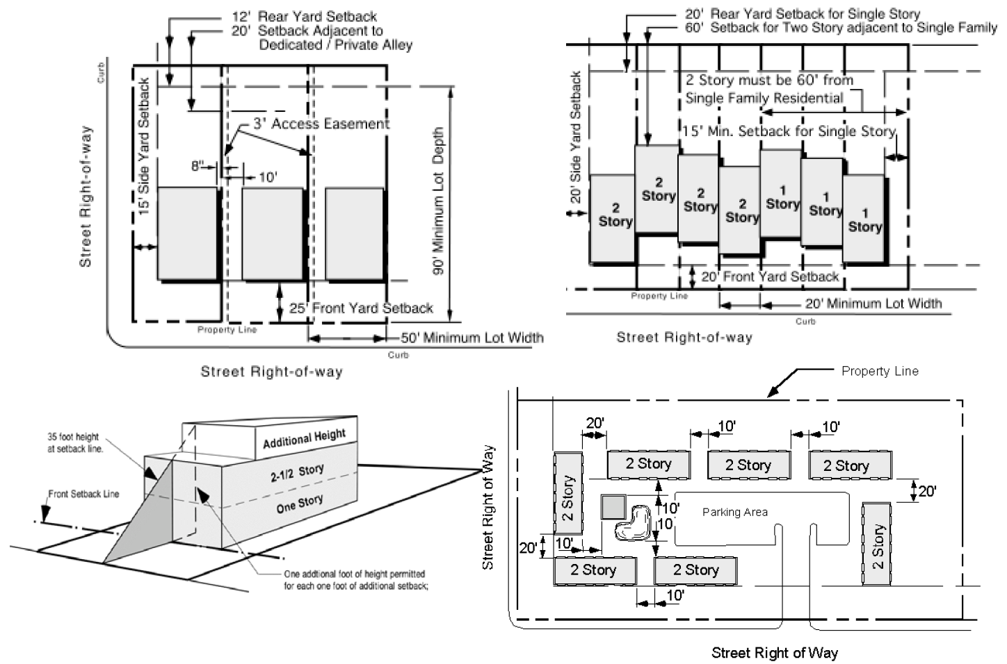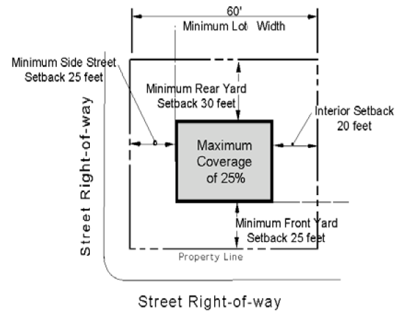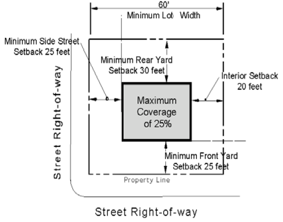 Property Development Standards. The minimum dimension of lots and yards and the height of buildings shall be as shown in the accompanying table and illustration.