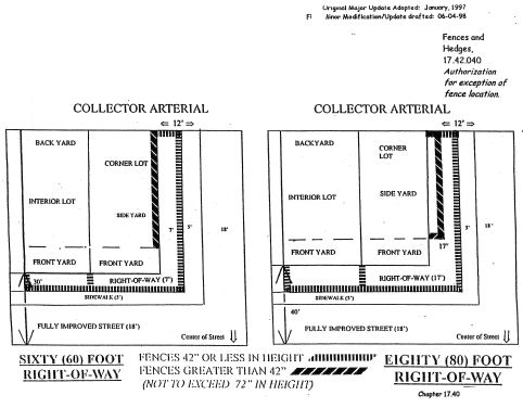 Fences or hedges abutting a street shall not exceed seventy-two inches in height, provided that they are a minimum of twelve feet back from the edge of the fully improved street or roadway. In all cases, any fence exceeding forty-two inches in height shall be a minimum of twelve feet back from the edge of the fully improved street or roadway.