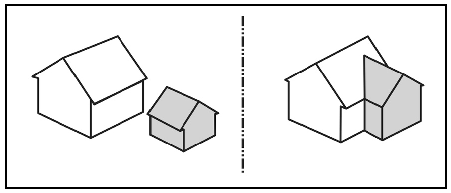 Accessory Dwelling Units can be detached from (left) or attached to (right) the primary unit.