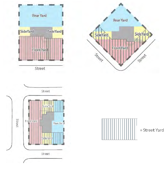 Yard, street means that portion of a yard between a property line along a street and the principal structure, extending parallel to the same property line along a street from the corner of the principal structure closest to the same property line along a street to another property line. Lots with multiple street frontages will have multiple street yards. Street yards may be in the front, side or rear yards. Street setbacks take precedent over side and rear yard setbacks.