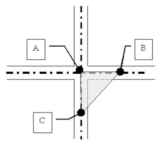 Arterial and arterial intersections. Vision corners shall begin at a point (B) along one arterial street centerline 150 feet from the centerline of the intersecting arterial (A) and shall traverse diagonally to a point 150 feet (C) along the centerline of the second arterial from the center of the intersecting arterials (A). Figure 122-601.1, vision corners, is provided for additional reference.