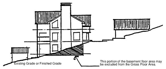 The Mercer Island Development Code excludes that portion of the basement floor area from the gross floor area which is below the existing or finished grade, whichever is lower. That portion of the basement which will be excluded is calculated as shown.