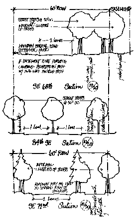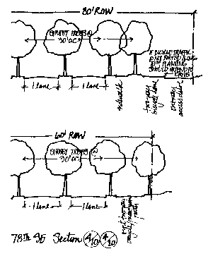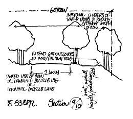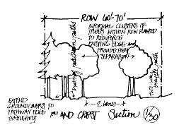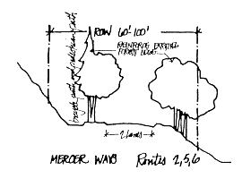 The segments of Mercer Ways classified as suburban are lacking tree cover enclosure and are very apparent disruptions to the continuity of the rural roadway experience. Planting is of particular necessity along these segments. It should reinforce the remaining forest edge where this is appropriate and in the more developed areas such as section 2/10, informal cluster planting of native materials is recommended as in subsection c. above.