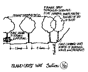 Maintain a narrow planter strip east of the existing sidewalk along the east side of Island Crest in order to provide a uniform planting buffer of ivy or similar vines along the rockery and retaining walls adjoining the sidewalk. Consider increasing the width of this sidewalk to six feet to facilitate pedestrian access to the Business District.