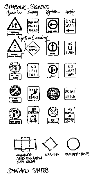 The use of symbolic signs as patterned after the international traffic symbols is gaining acceptance in this country. The 1971 Manual on Uniform Traffic Control Devices shows increased reliance on symbols with minimal word use as a transition toward a more uniform and better understood system of symbolic signing. There is no doubt that symbols, once accepted by the general public, offer greater clarity and legibility than the current, lengthy verbal directives in use. Because properly designed symbolic signing is more readily perceived and comprehended than its verbal counterpart, the number of necessary signs may be significantly reduced.