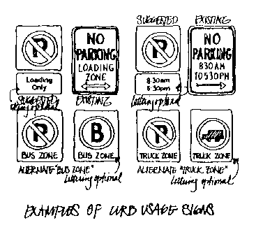 Curb Usage Signs: Curb usage signs pertain mostly to the Business District. There are various other locations on the Island where "no parking" signs are used, but they are relatively few. Bus zone symbols may be used Island wide. Stopping or standing regulations may be particularly applicable at schools and other public facilities.