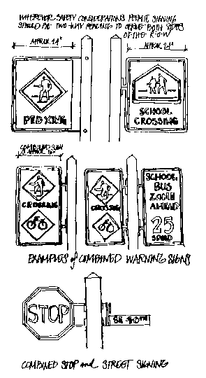 Wherever safety considerations permit, the size of all signs and accompanying verbal guidance should be reduced in size as permitted by the Manual on Uniform Traffic Control. Use of symbols that offer greater legibility along with smaller size should be employed. Warning signs for trail crossings should be combined with actual trail signs wherever possible, particularly along the rural rights-of-way. The incorporation of the diamond warning symbol and verbal guidance message as a part of a rectangular background should be considered for it has distinct advantages for establishing a uniform mounting system and for the incorporation of additional signs.
