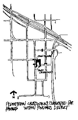 Crosswalks: The major pedestrian crosswalks within the Business District should be indicated by a differentiation of pavement as opposed to striping. The pavement should be complementary to that used for adjoining sidewalks as well as pavement within the future town square which the majority of these crossings adjoin. It is the intent that paving within the town square as well as other pedestrian precincts, be of a unit type material such as concrete pavers, brick, tile, etc.