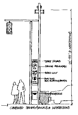 Integrate signing, street signing and directional signals with the lighting standards throughout the Business District, at major intersections and at other locations if appropriate.