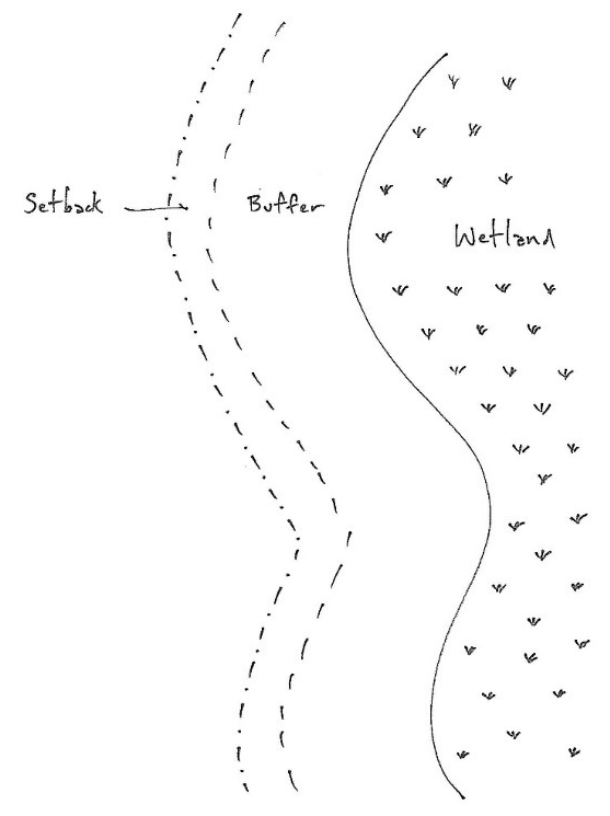 Buildings and other structures shall be set back a minimum of ten feet from the edges of a wetland buffer. The distance may be reduced to five feet if: