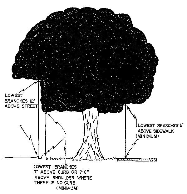 Branches over sidewalks shall be trimmed to a minimum of eight feet above the sidewalk and one foot behind the sidewalk (see Figure 1).
