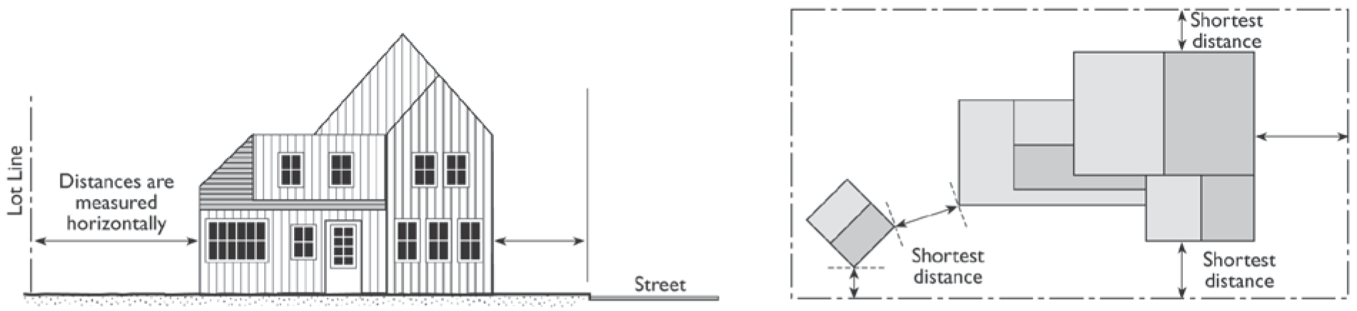 Distances are Measured Horizontally. When determining distances for setbacks and structure dimensions, all distances are measured along a horizontal plane from the appropriate line, edge of building, structure, storage area, parking area, or other object. These distances are not measured by following the topography or slope of the land.