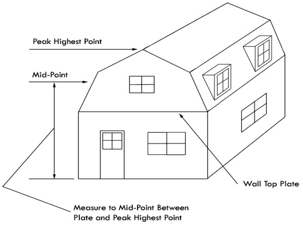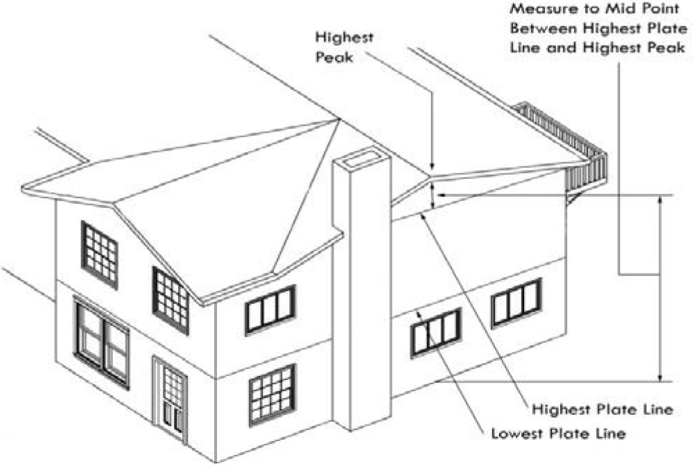 Measuring Building Height. Building Height is measured from the average level of the highest and lowest point of that portion of the lot covered by the building to the mean point between the plate line (where the vertical wall attaches to the roof) and the highest point of the roof ridge, or to the top of a parapet wall or flat roof.