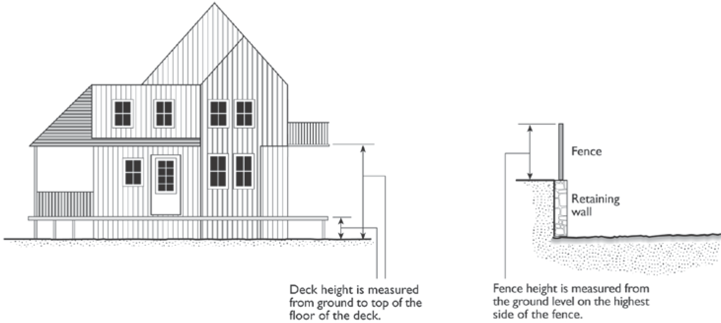 FIGURE 11-2-3.E.4: MEASURING HEIGHT DECKS AND FENCES ON RETAINING WALLS