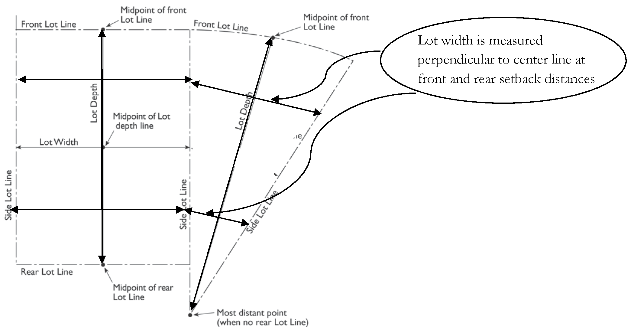 Lot Depth. Lot depth is measured along an imaginary straight line drawn from the midpoint of the front property line of the lot to the midpoint of the rear property line or to the most distant point on any other lot line where there is no rear lot line.