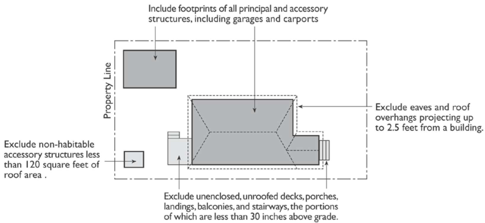 Determining Building Coverage. Building coverage is the ratio of the total footprint area of all structures on a lot to the net lot area, typically expressed as a percentage. The total footprint of all principal and accessory structures, including garages, carports, covered patios, and roofed porches, is used to calculate building coverage; except the calculation excludes the following areas: