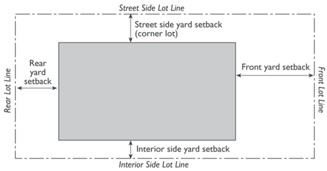 Determining Setbacks for Yards. A setback line defining a required yard is parallel to and at the specified distance from the corresponding front, side, or rear property line. The following special regulations for determining yards apply when a lot abuts a proposed street or alley: