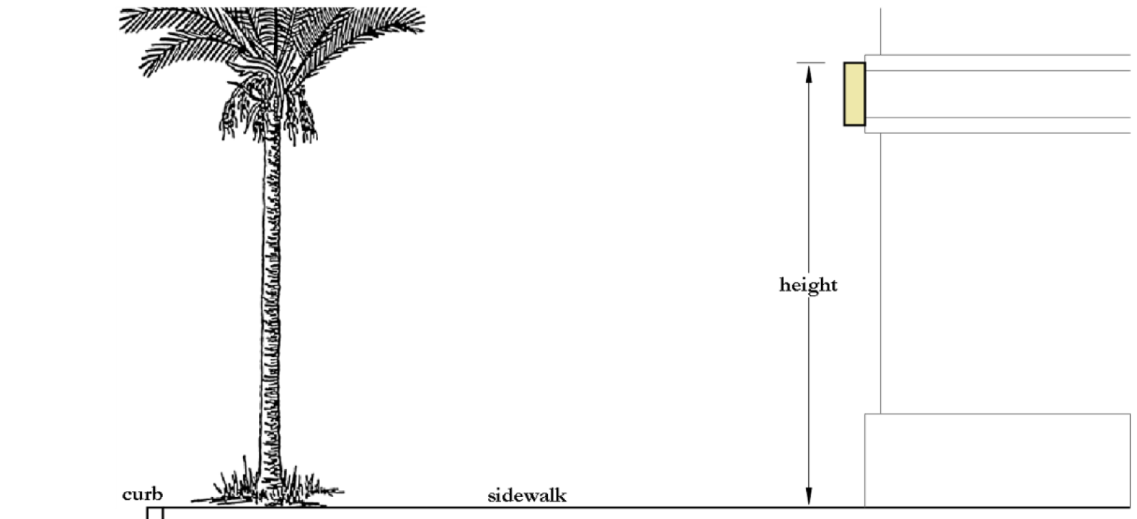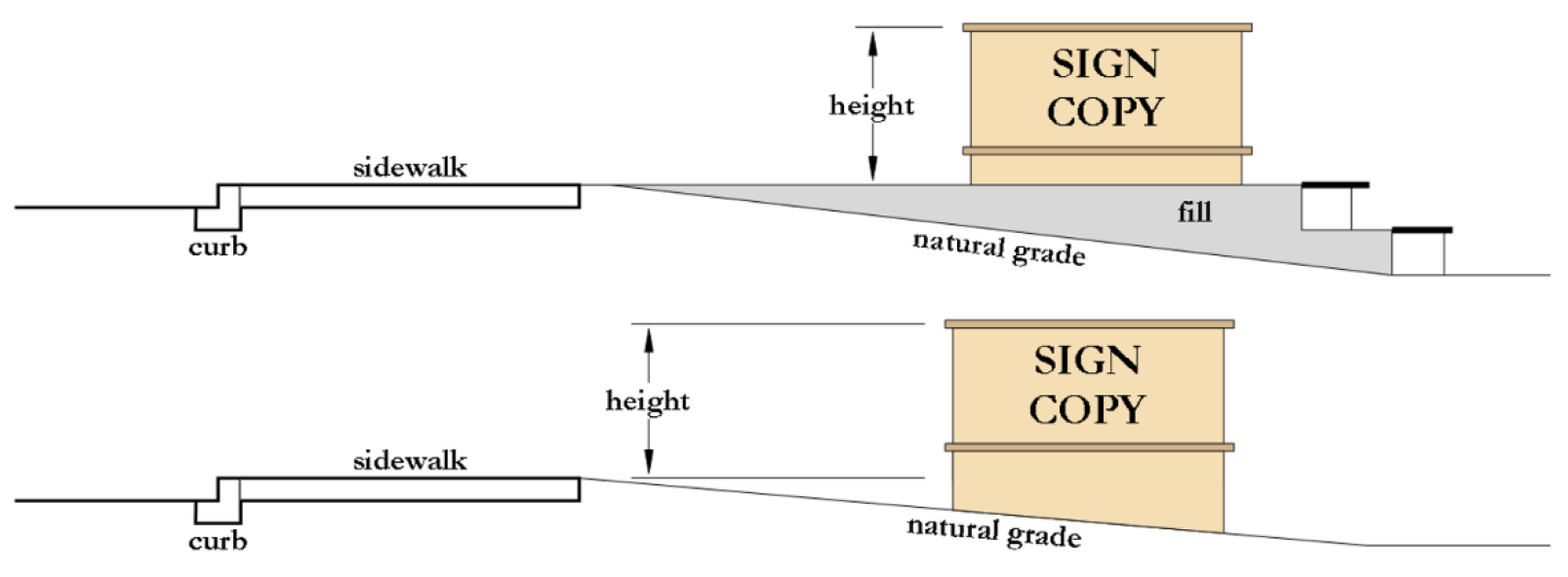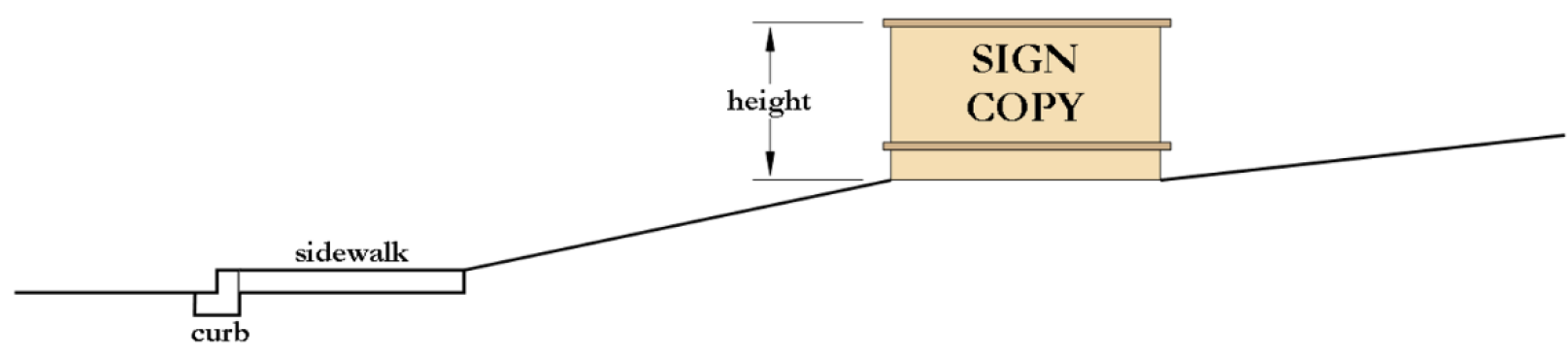 Height: The vertical distance to the top of a sign, excluding embellishment, measured from the nearest curb, sidewalk, or street grade.