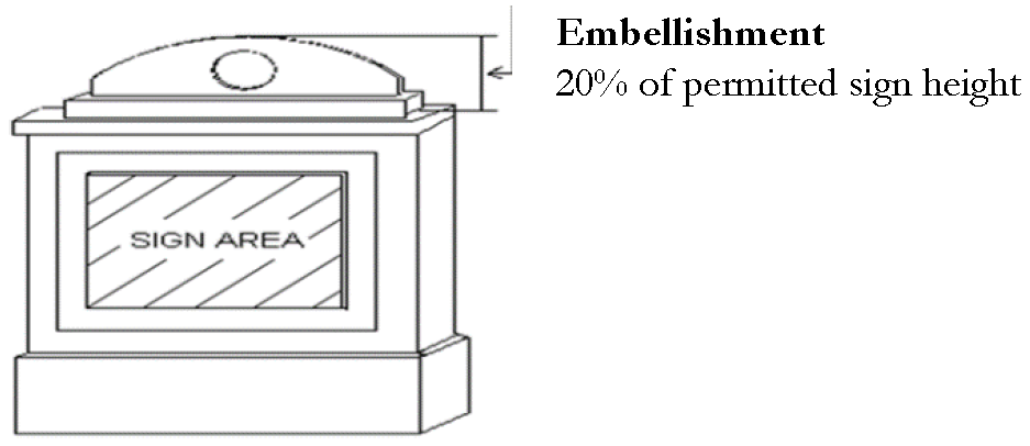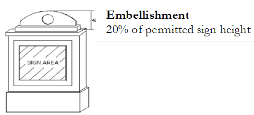Embellishment: Structural or decorative elements of a sign incorporating representations of the significant architectural features of the associated building or development; does not include the portion of the sign structure counted as the sign area.