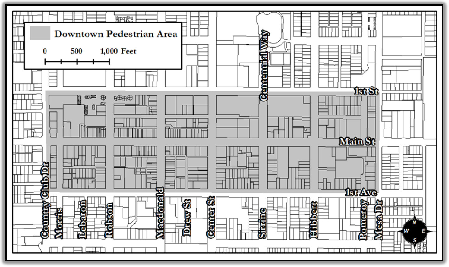 Downtown Pedestrian Area: The Downtown Pedestrian Area (DPA) is designated, as depicted in Figure 11-50-3-A below, as the east side of Country Club Drive to the west side of Mesa Drive, the south side of 1st Street to the north side of 1st Avenue. The centerline of the streets shall be construed to be the boundaries. This area is characterized as the most intensely developed governmental, cultural, and business core.