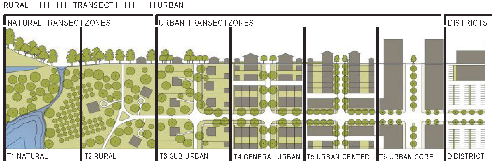 The Transect is an organizing principle often used in Form-Based Coding that focuses first on the intended character and type of place and second on the mix of uses within. This differs from the framework found in conventional or Euclidean zoning in which use, rather than form, is the primary focus. Transect-based zone districts are used to regulate the preservation, evolution, and creation of walkable places. The Rural-to-Urban Transect is a means for considering and organizing the human habitat in a continuum of intensity that ranges from the most rural condition to the most urban. It provides a standardized method for differentiating between the intentions for urban form in various areas using gradual transitions rather than harsh distinctions. The zones are primarily classified by the physical intensity of the built form, the relationship between nature and the built environment, and the complexity of uses within the zone.