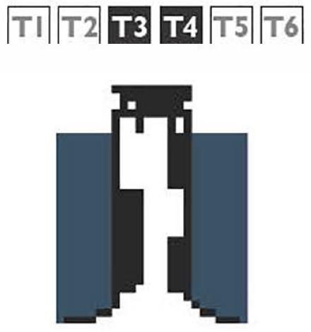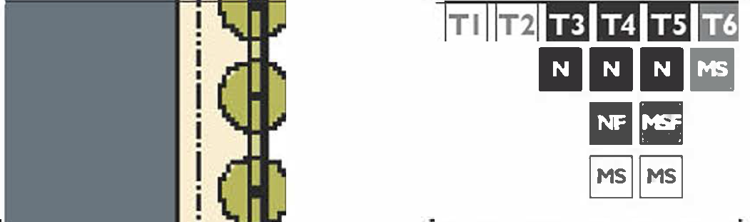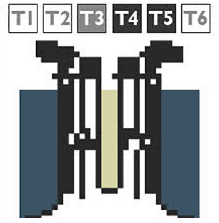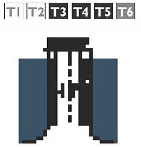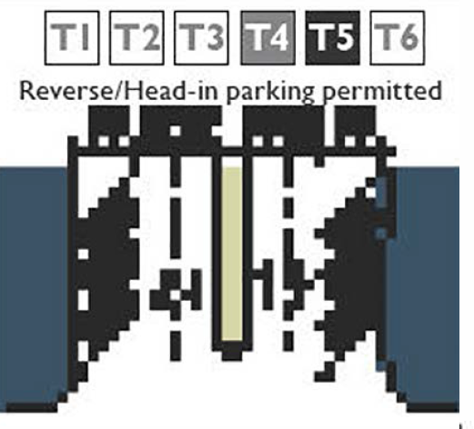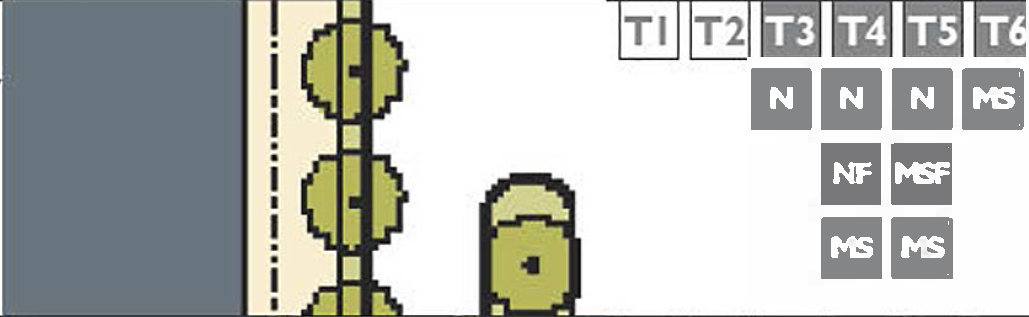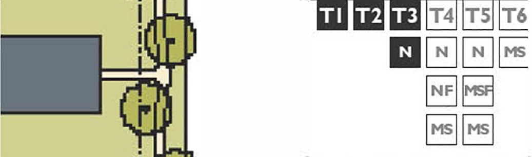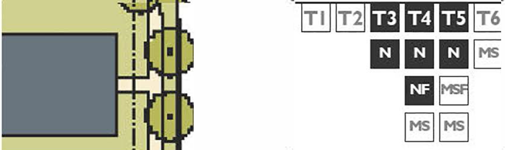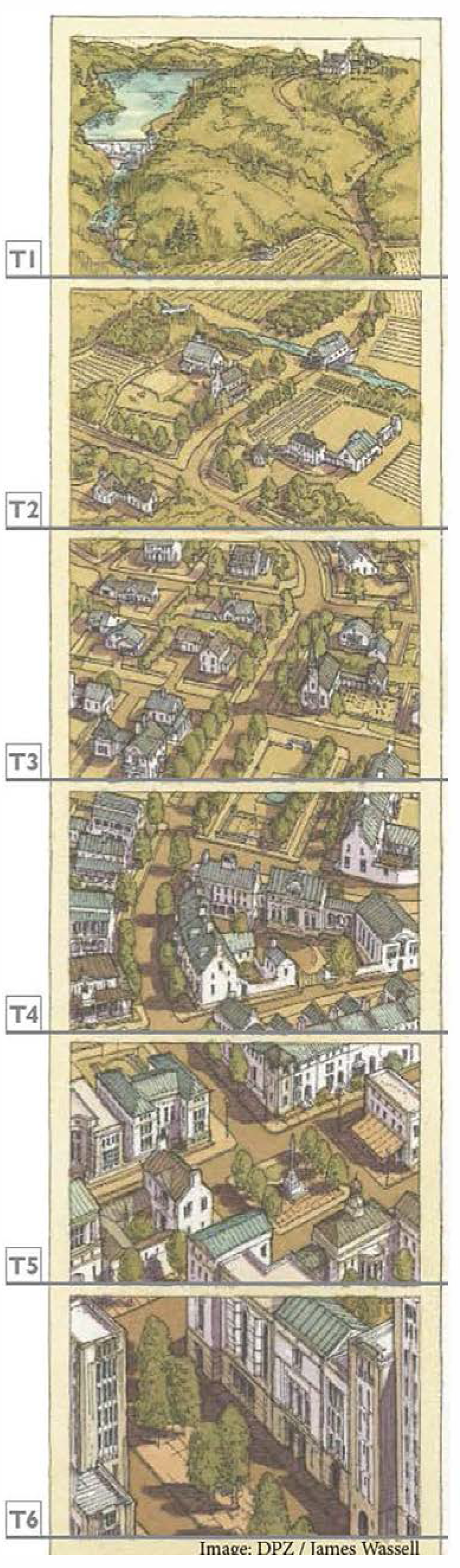 The model transect for American cities is divided into six transect zones or T-zones: Natural (T1), Rural (T2), Sub-urban (T3), General Urban (T4), Urban Center (T5), and Urban Core (T6), together with a Special District (SD) designation for areas with specialized purposes (e.g., heavy industrial, transportation, entertainment, or university districts, among other possibilities).