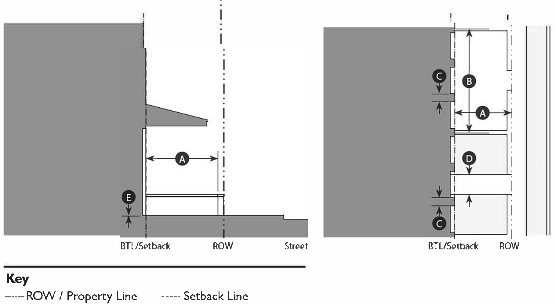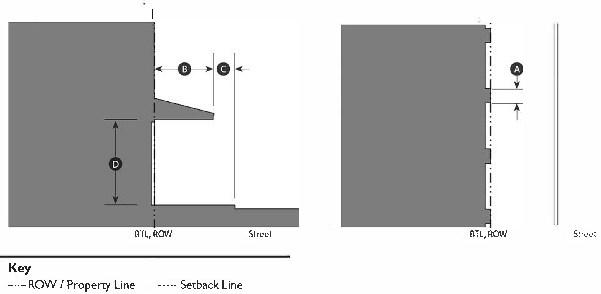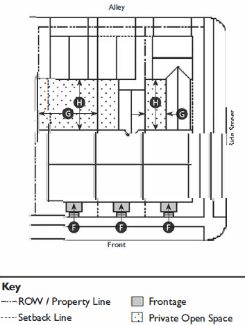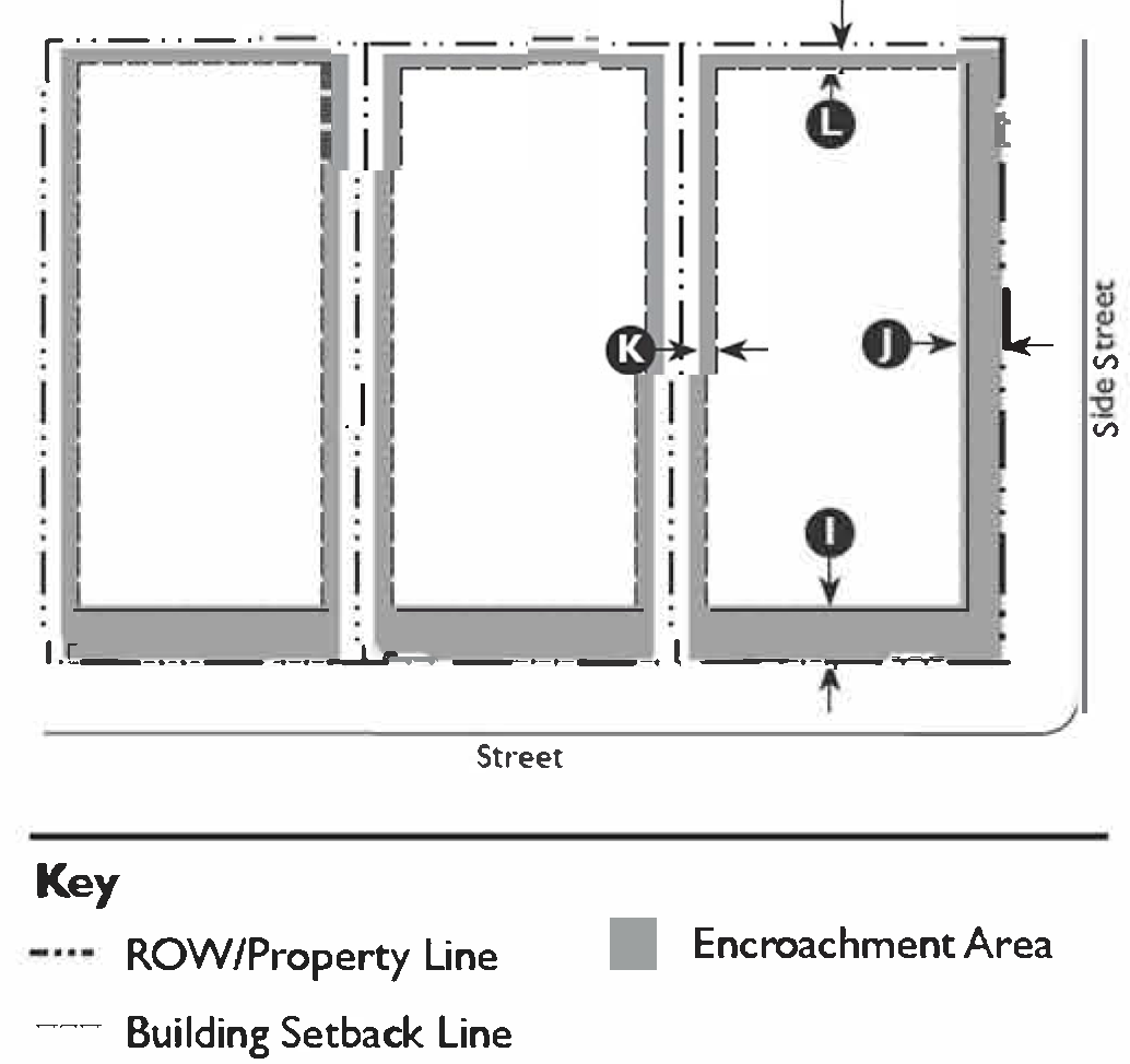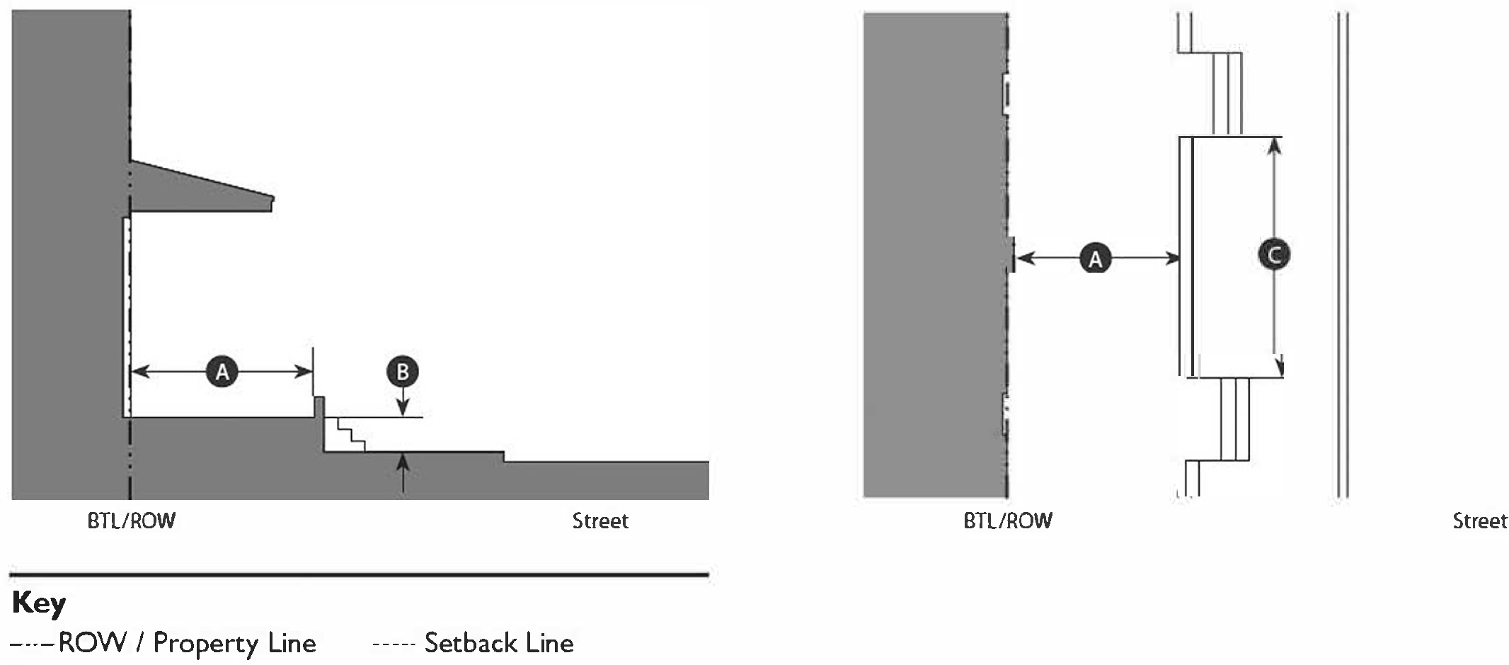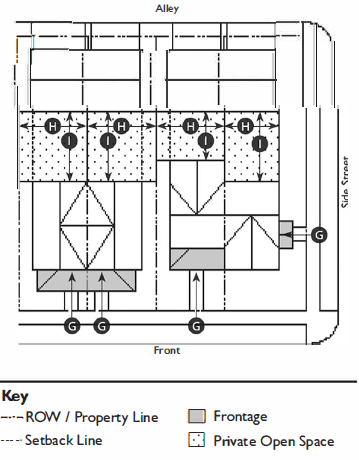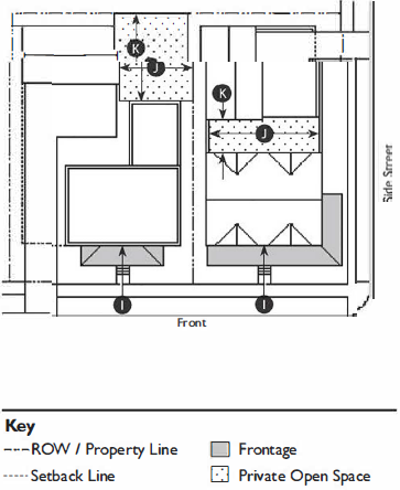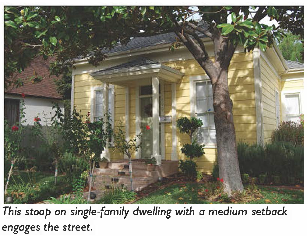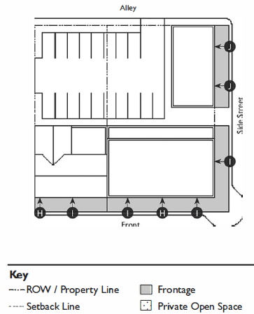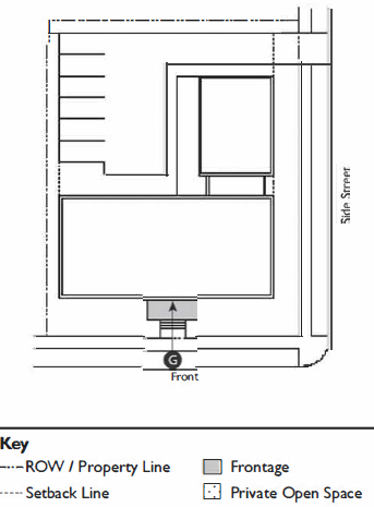 The Private Frontage Standards Chapter supplements the Building Form Standards by setting forth the standards for the components of a building that provide an important transition and interface between the public realm (street and sidewalk) and the private realm (yard or building). See Chapter 60 (Private Frontage Standards).