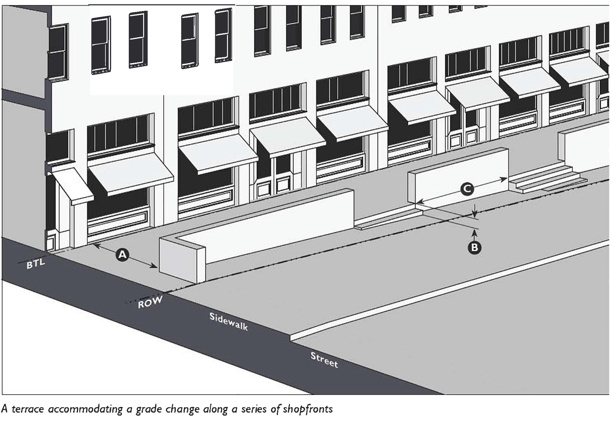 Terrace. A Private Frontage Type. See Chapter 60 (Private Frontage Standards) for a description of and regulations for this private frontage.