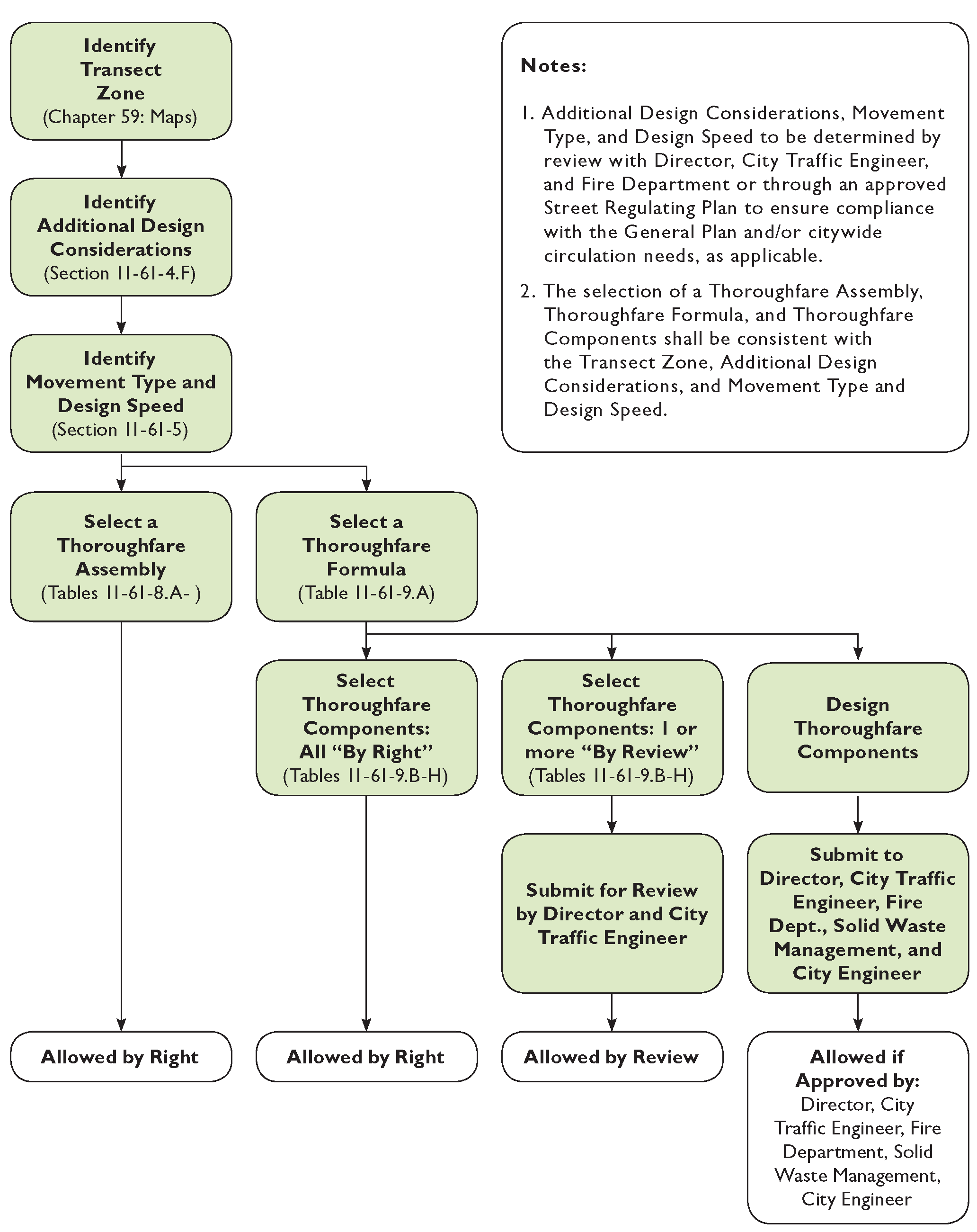 The Thoroughfare Standards Chapter provides the components of a thoroughfare and thorough fare assemblies that can be used to create walkable streets that balance the needs of vehicles, pedestrians and bicyclists. See Chapter 61 (Thoroughfare Standards).